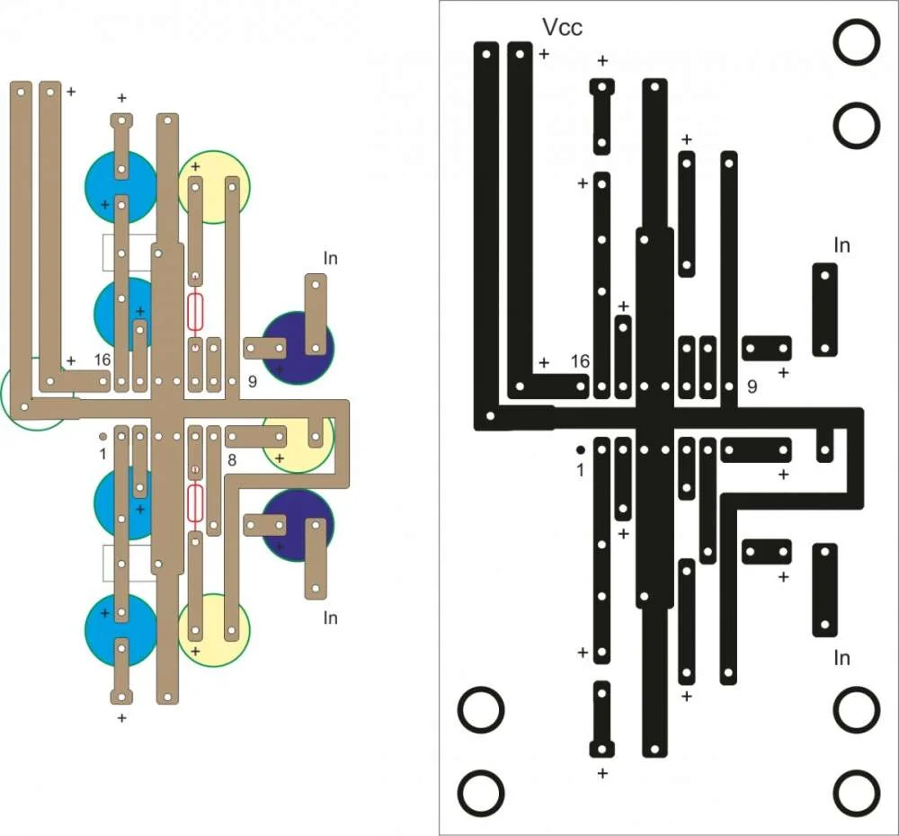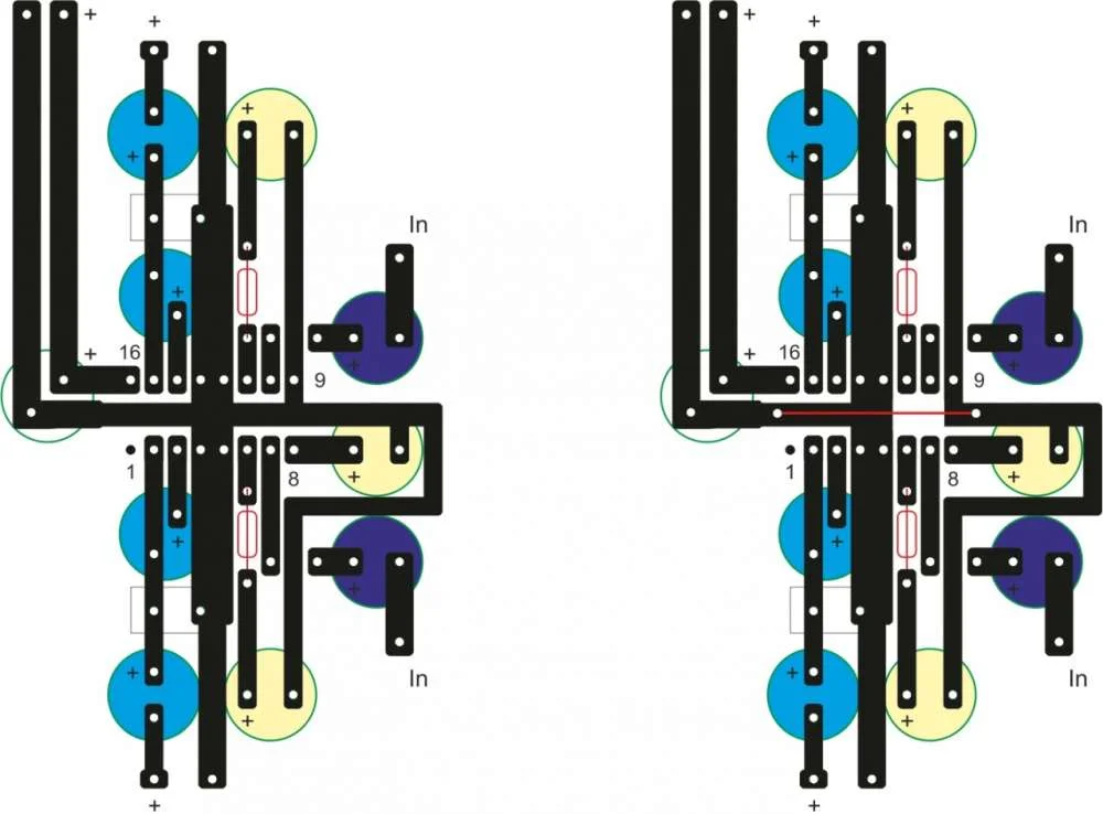 плата нормуль сделана.. не айс только что входной сигнал перпендикулярно пересекается с массой...поставьте нормально экранированный сигнальный шнур, на питание (лучше на плате) паралельно C10 поставьте кондёрчик 0,33-1мкф, ну я бы ещё шунтировал входной сигнал до разделительных конденсаторов относительно массы разумеется кондёрами примерно 100 пкф (хотя может этого и не понадобится)
