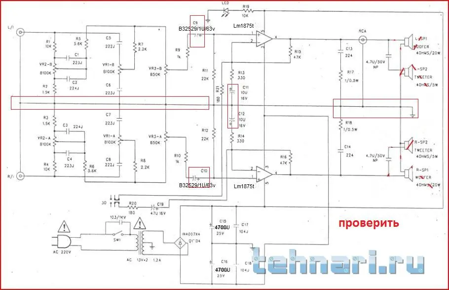 Ура!!! Всё заработало!!! В итоге было проделано следующее: заменены сами микросхемы ( хотя я сомневаюсь что это нужно было делать), заменены диоды диодного моста, заменены конденсаторы питания на 1000мкф 63 вольта ( мне кажется 1000мкф мало, но других пока нет) и пропаян заново выход на сами динамики ( было плохо припаяно и из-за этого пропадал звук). Всем огромное СПАСИБО за помощь!!!!