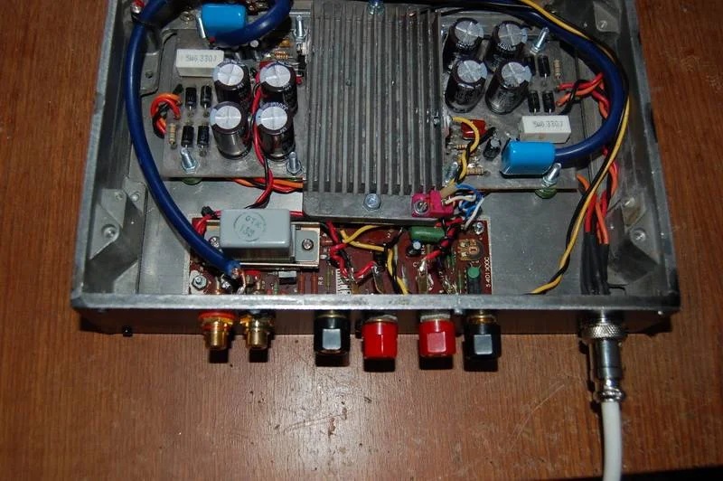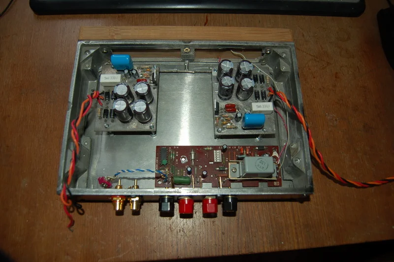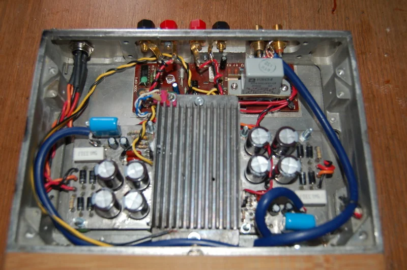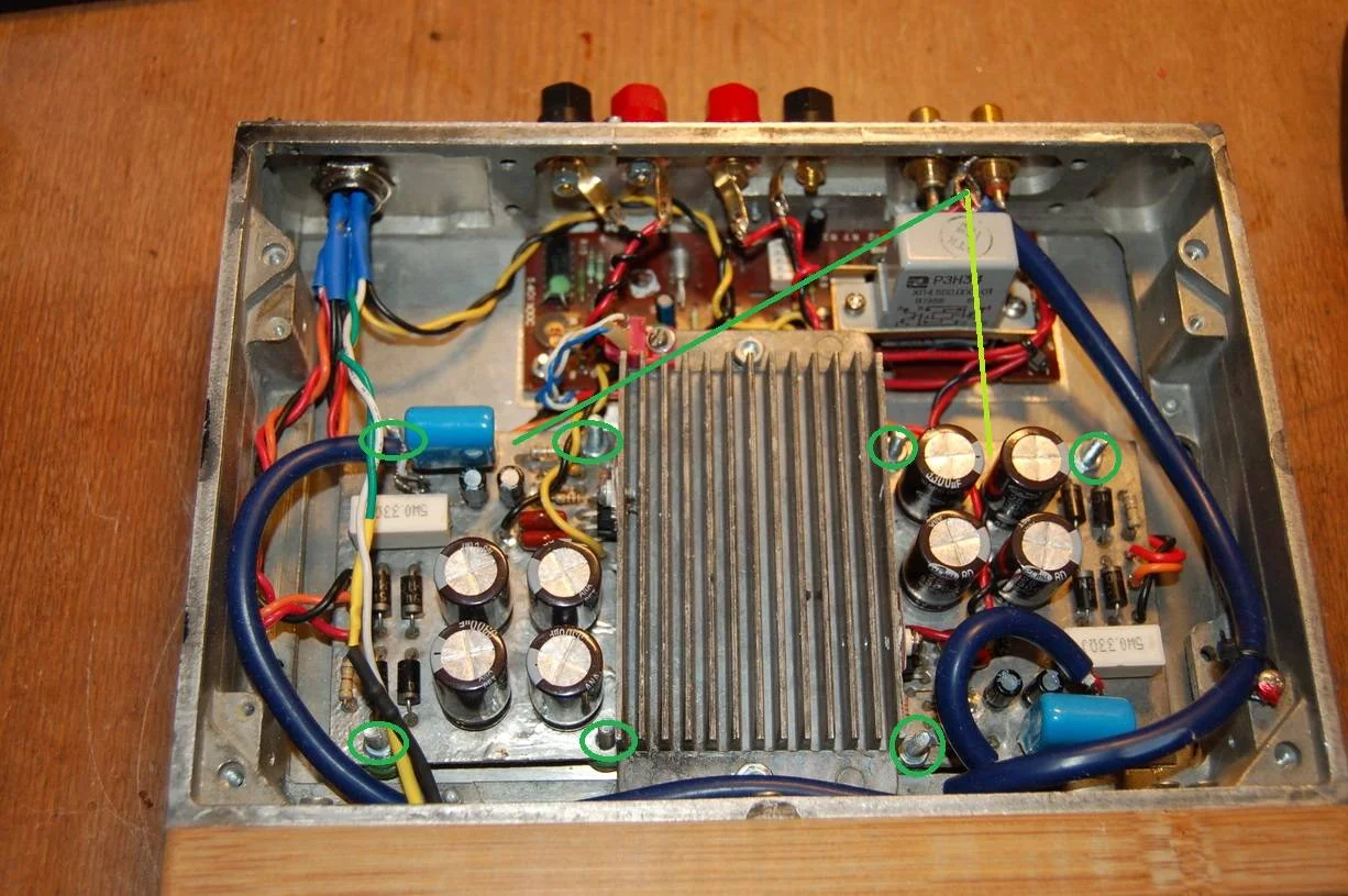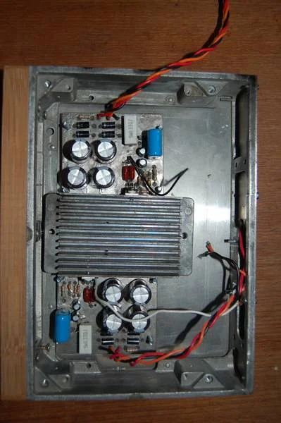 У Вас, судя по фотографиям, ошибка в монтаже. Полигоны общего провода печатных плат не должны соединяться с корпусом. Корпус (шасси) в Вашем случае должен соединяться только в одной точке - на входных разъёмах.