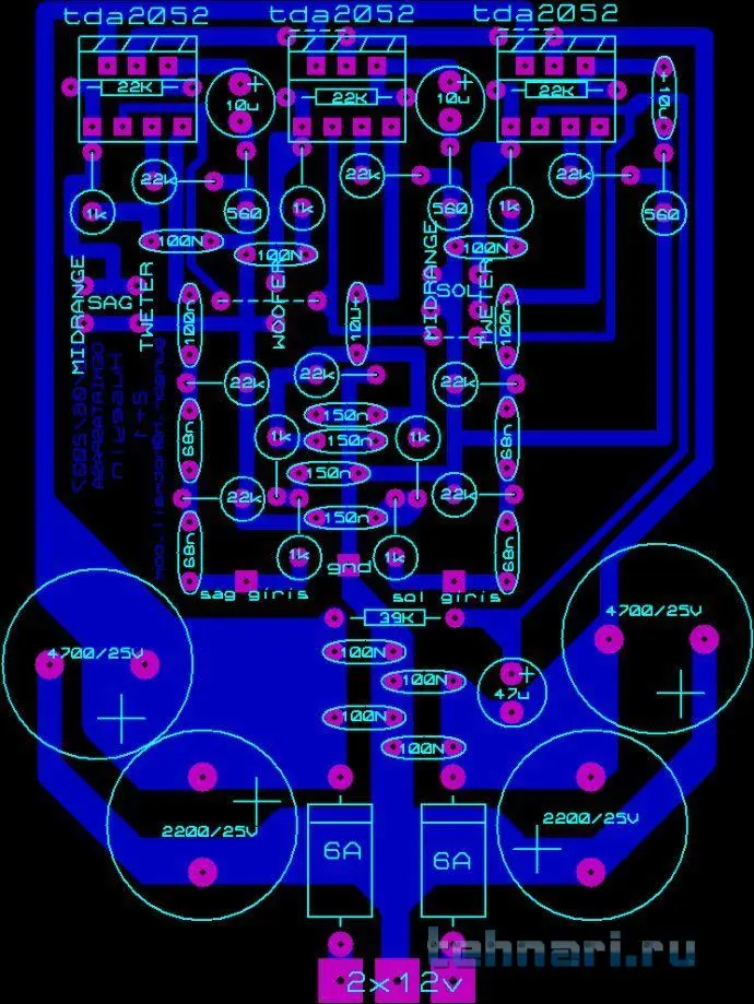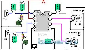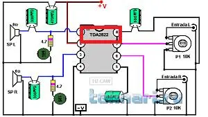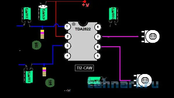 У него есть TDA2052 и даже печатная плата под неё. Но он совершенно ничего не понимает в обозначениях элементов и понятия не имеет что делать с печатной платой и зачем она вообще нужна. Он хочет чтоб ему наглядно нарисовали, желательно в 3D, как нужно соединить детали чтоб получился усилитель. Печатные платы ему не нужны, нужен наглядный рисунок как соединить детали между собой. Рисунок с TDA2822 он привел для того, чтоб лучше поняли чего он хочет.