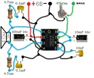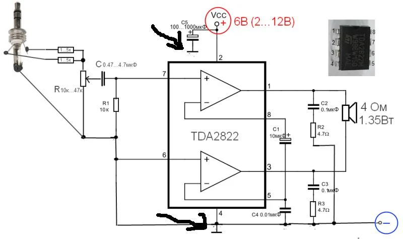 Собрал усилитель по ранее предложенной схеме все хорошо вот только когда подключаю его к 6 вольтам то он работает не на всю можность начинает хрипеть динамик а если подключаю к 12 вольтам то играет громко и даже не шипит вот только начинает быстро греться микросхема в чем причина может быть?? или это так и должно быть???