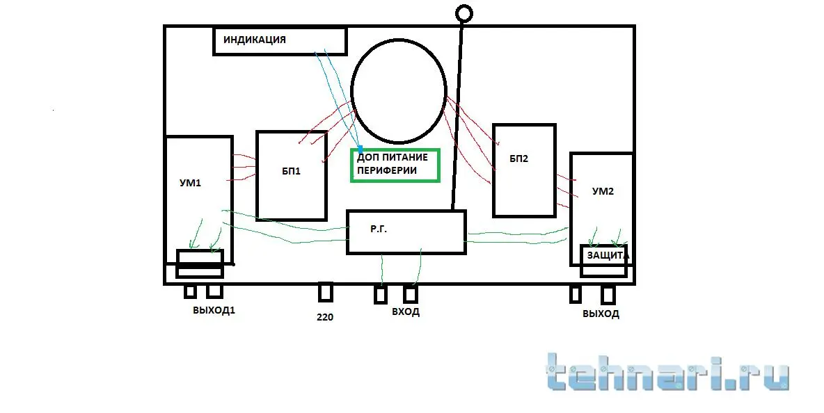 Спасибо, теперь понял зачем делить плату защиты, но у меня так не получится, задняя стенка уже рассверлена как показано на моем рисунке. Теперь про регулятор громкости: можно сократить длину провода, если отодвинуть регулятор к задней стенке, прямо к клеммам, но ведь потом все равно придется тянуть входной провод через весь корпус до индикаторов.