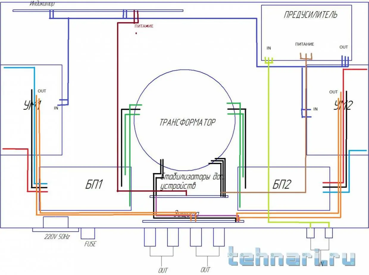 Предусилитель, все сигнальные провода и цепи желательно разместить как можно дальше от трансформатора питания.