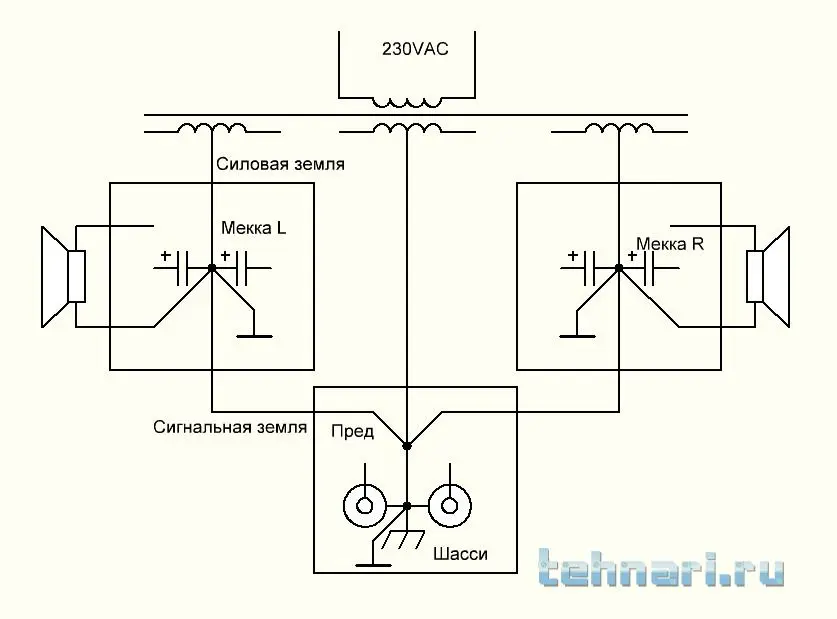 Каждый канал соединяется с корпусом только на входных разъёмах.