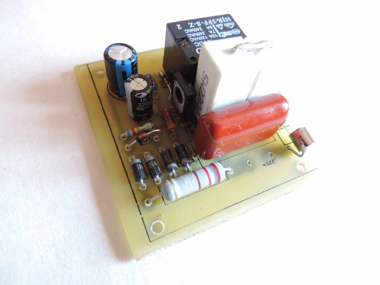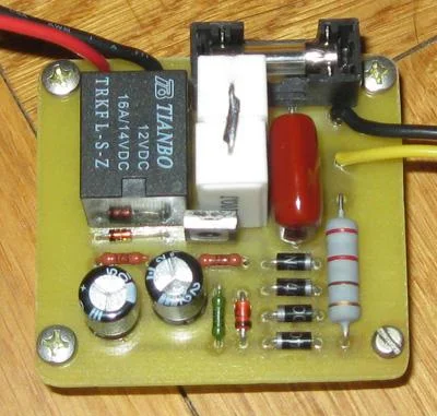 Замени резистор керамический 5-ти ватт с 20 Ом на 40 Ом каждый, чтоб получить в сумме не 40 Ом а 80 Ом. Оно позволит больше снизить стартовый ток. При увеличении емкости конденсатора С3 увеличишь время задержки включения реле.