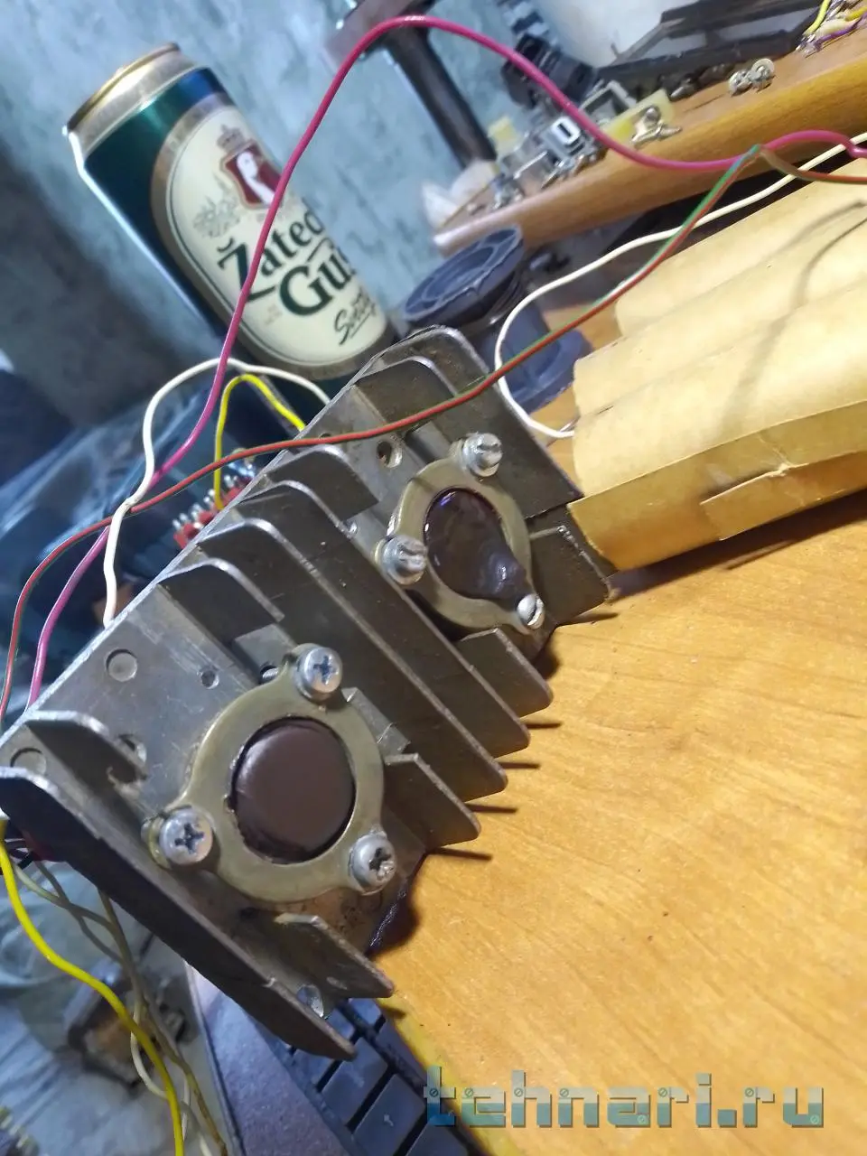 Только один перегревается? Может быть или возбуд в том плече, или прокладка под ним толще, или постоянка небольшая на выходеДобрый вечер. Вот вам и усилок сам охренел питание +-30в погонял минут 40 с компа на всю ,ток покоя выставил(на горячею) 0.01 сопротивления 0.27 один диод на радиаторе вот что получилось.Прокладки от баклашек вырезал пробки расплавились это что он больше 100 нагрелся?