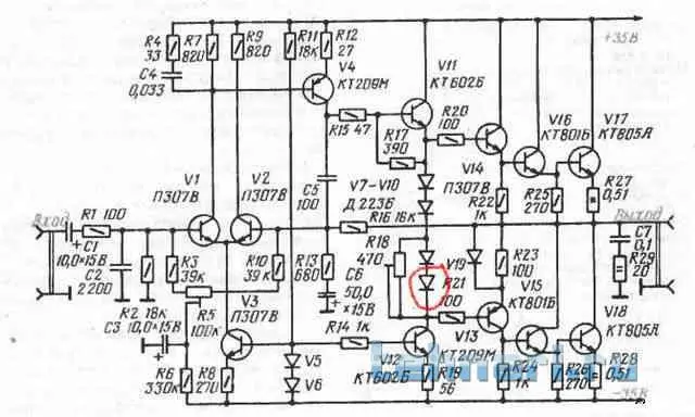 Возьми КТ815, замкни у него эмиттер с базой и подключи вместо выделенного красным диода. Прикрепи этот транзистор (диод) на радиатор верхнего выходного транзистора максимально ближе к нему. Должно "наступить счастье".может лучше так сделать