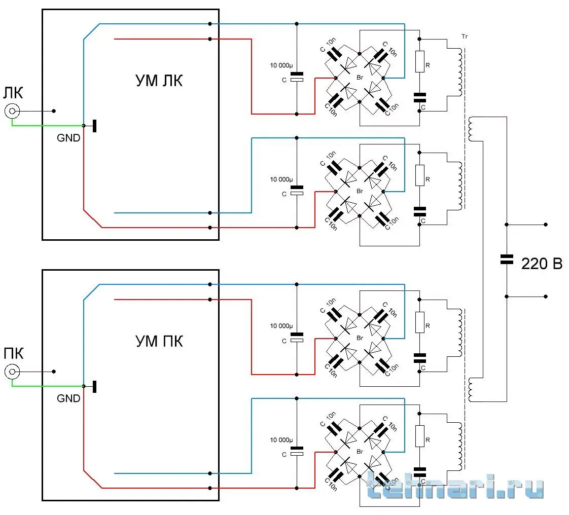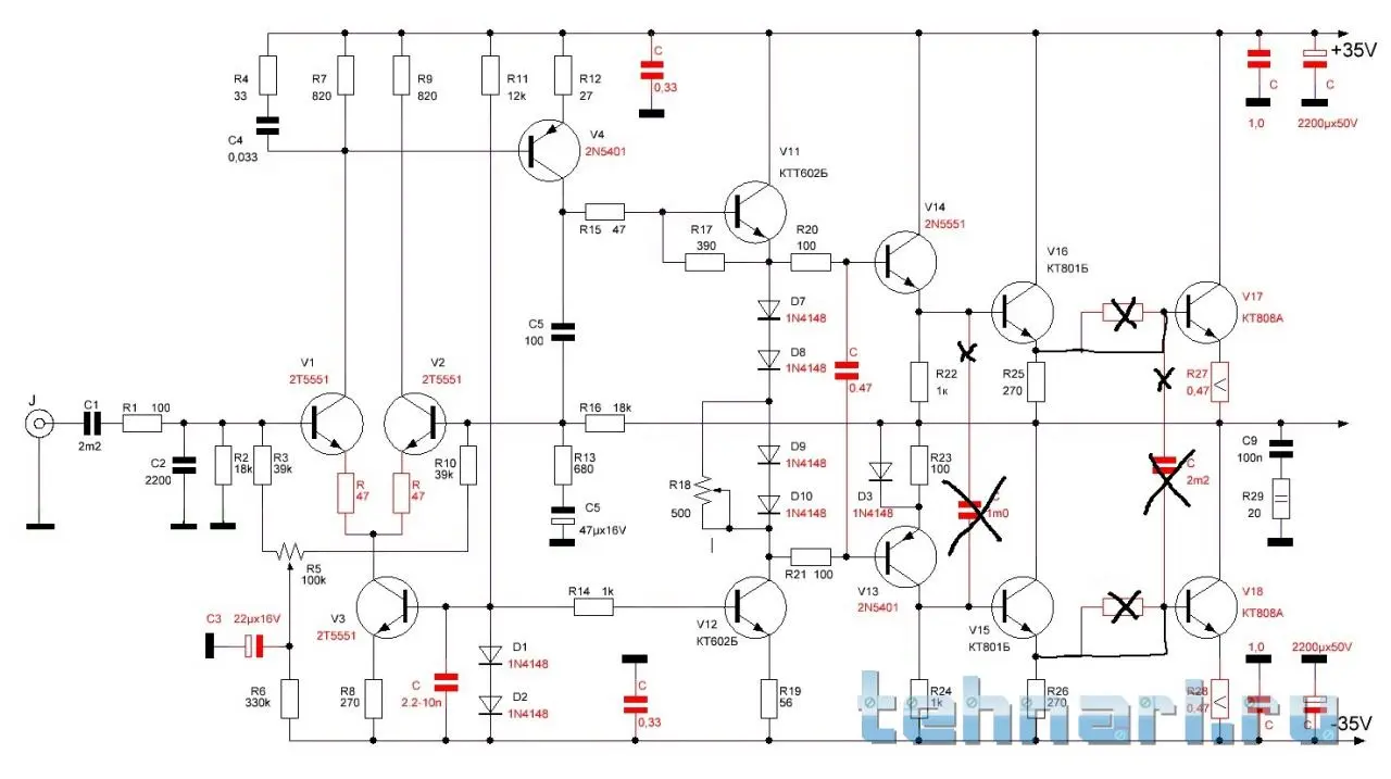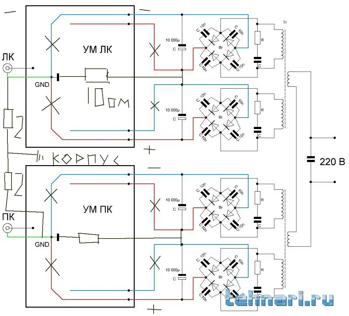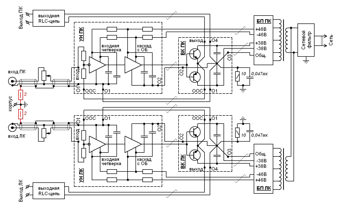 Лично у меня складывается ощущение, что корень Ваших проблем находится в питании. Даже не столько в питании, сколько в разводке земли. На Вашем месте взял бы пару конденсаторов на 4700...10000 мкФ, и сделал бы нормальную среднюю точку, как положено. Буквально пару дней назад возился с усилителем Одиссей 002, в одном канале при прибавлении громкости возникало возбуждение на ИНЧ. Всё перепроверил, и все было в норме. Но вот на фильтр питания внимания не обратил, а надо было. Принесли его мне после профилактики у другого мастера. Тот поменял конденсаторы фильтра на импорт, собрал из них батарею, и включил в схему очень своеобразно - земля с силового трансформатора соединялась с шасси в одной точке, туда же сходились все общие провода. Т. е. вроде бы классическая общая точка, если бы не конденсаторы фильтра, которые тоже подключались туда... десятисантиметровым куском провода. Вот как только привёл в порядок этот узел, и возбуждение сразу же ушло. Поэтому теперь очень внимательно стараюсь подходить и к этому вопросу