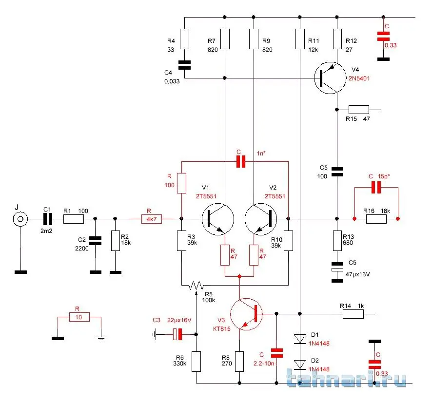 Тема усилитель Сырицо с отрицательным выходным сопротивлением, пост 68-82, с. 7-9. Между базами дифкаскада 1000 пф(68 пф в моем случае, пришлось подбирать) - 100 ом , последовательно на входе 4,7 ком.Не нашёл информацию. Это как?