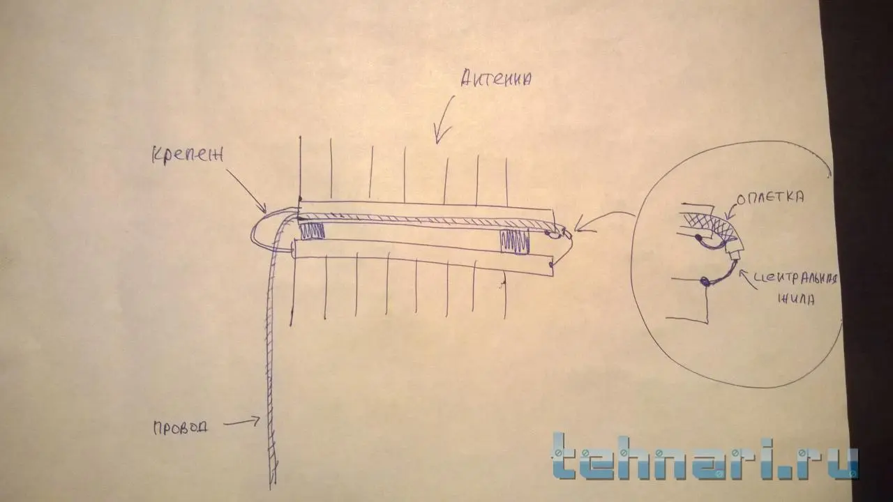 Может у заводской антенны подключение другое или схема?...У меня на самодельной центральная жила провода никак не контачит с оплеткой. Они припаяны к разным частям антенны. Нарисовал как-то так)))