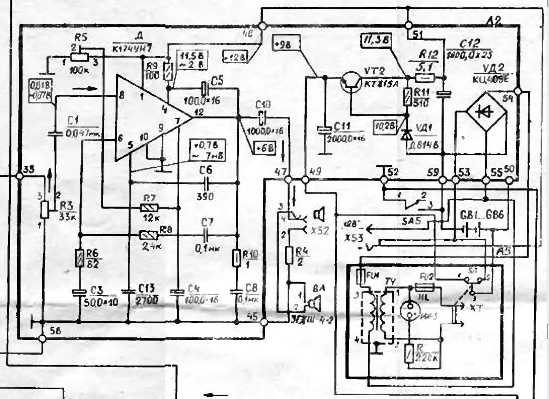 Если нужно задействовать мост, то переменное напряжение с трансформатора подаётся на контакты 54 и 55. При этом контакт 53 нужно замкнуть с контактом 51