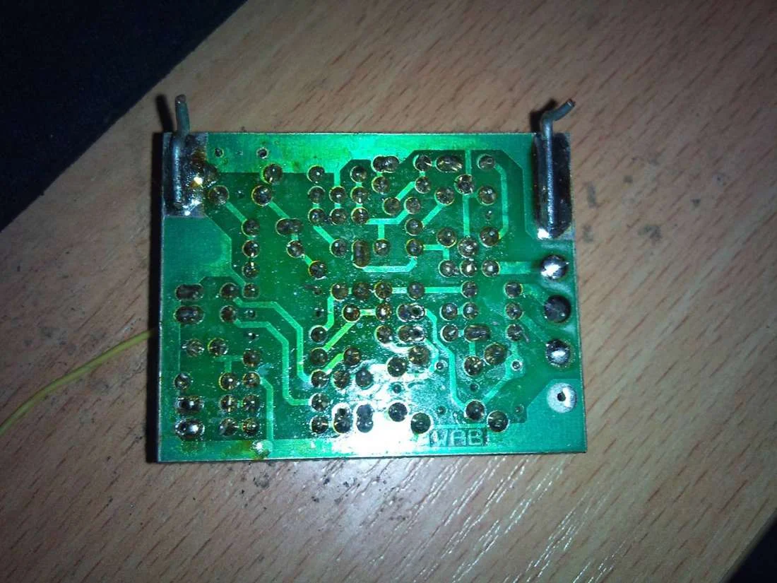 Вот фото, средняя ножка земля, левая к транзистору и через кондер к микросхеме, правая соединена с фильтром на 5.5 и через резистор на микросхему.
