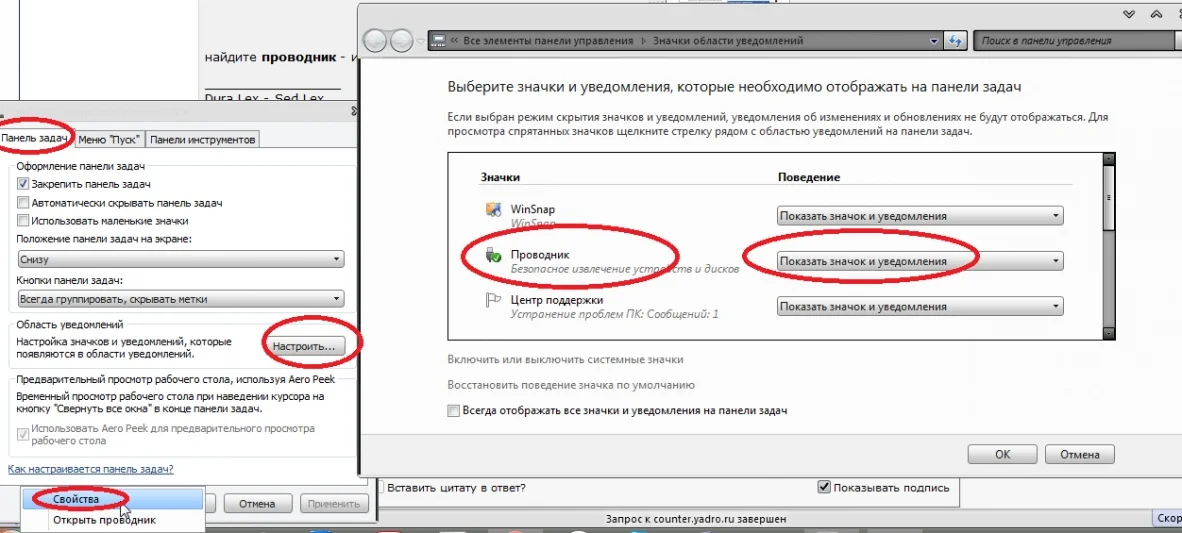 зайдите в свойства "меню пуск"( правой кнопкой на меню) пуск - свойства - "панель задач" - "настроить" -( (откроется настройка области уведомления) там найдите проводник - и поставьте показать значек и уведомления)sshot-1.webp