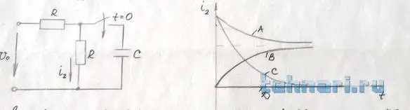 Перерисовываем схемы для этих двух частных случаев и смотрим на графики. Для t=0 подходят графики А и С, а для t=∞ - А и В. Какой график удовлетворяет обоим этим условиям? Случайно, не А? ;)