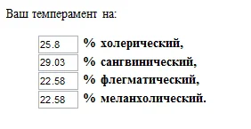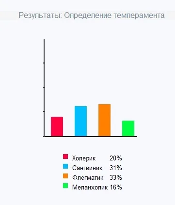 Если результат по какому-либо типу составляет 40 % и выше, значит, данный тип темперамента является у вас доминирующим, если 30 - 39 % - то качества данного типа выражены достаточно ярко, если 20 - 29 %, то качества данного типа выражены средне, если 10 - 19 %, то качества данного темперамента выражены в малой степени.