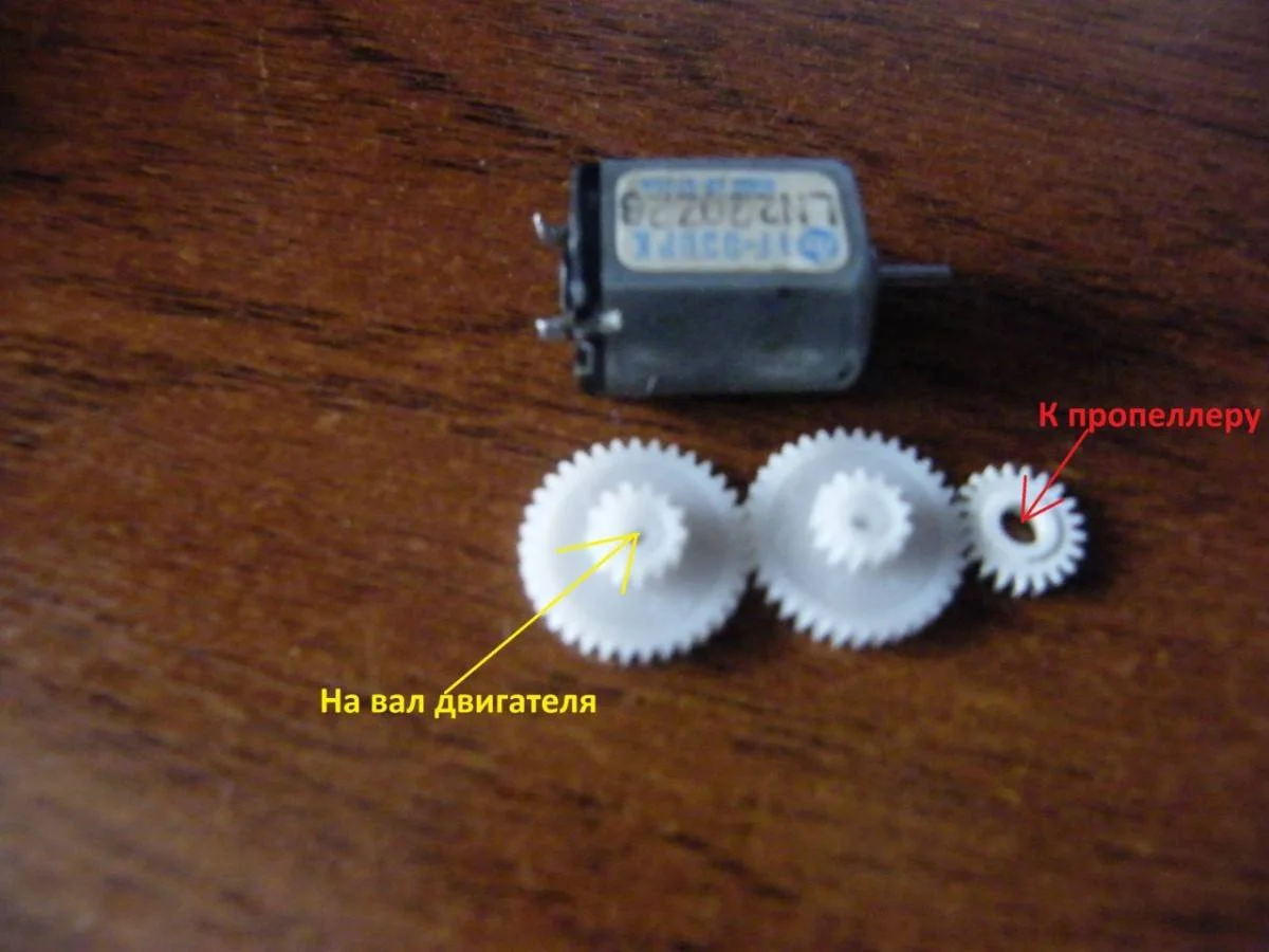 Уважаемый Миша Капров! Нужно делать следующим образом. На двигатель самую маленькую шестеренку, а на вал винта самую большую - такой на вашем фото в первых постах увы нет.. Вобщем диаметр шестерни вала винта должен быть 5см, а диаметр шестерни вала мотора - менее 1см... Размах обоих винтов около 50см, а ширина лопастей около 3,5см.. Я уже делал вертолет и хочу сказать - главное сила а не обороты, при таком размахе оборотов ему будет более чем достаточно, у меня вертолет взлетел на 1,5 км, сделал несколько снимков и после чего упал и разбился... но фотки остались.. Непомню тока где, найду - выложу.