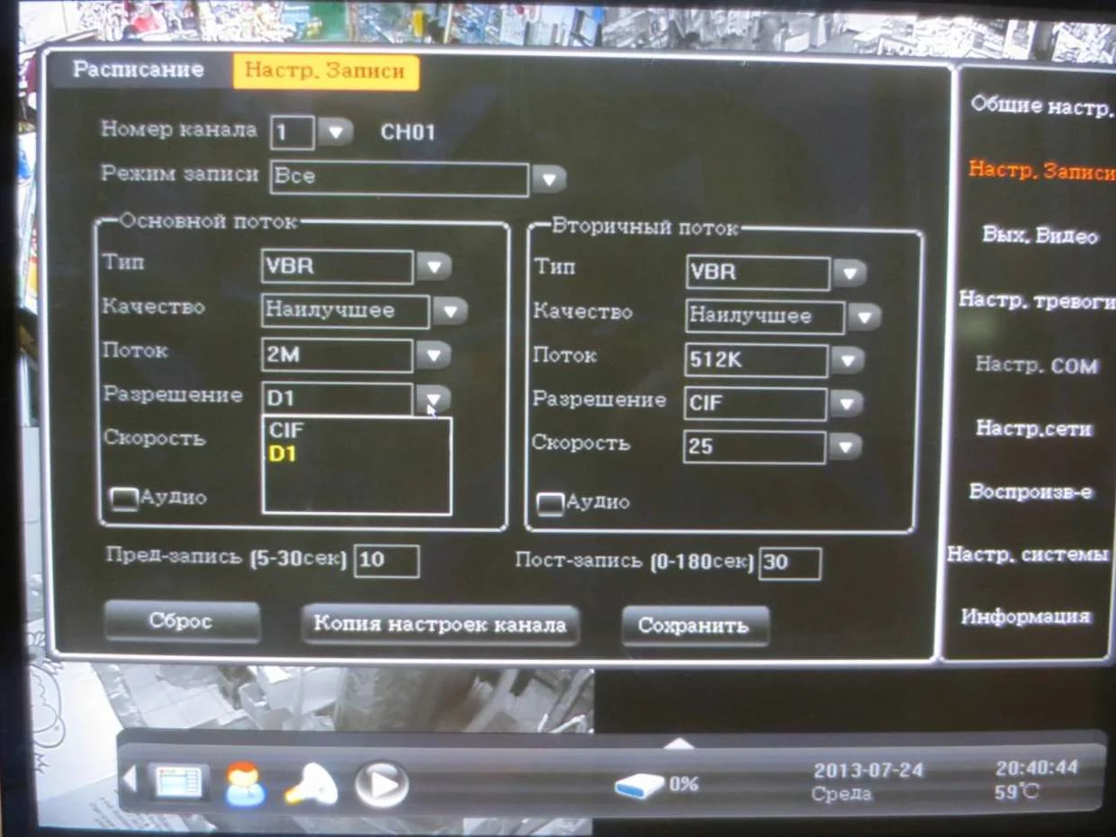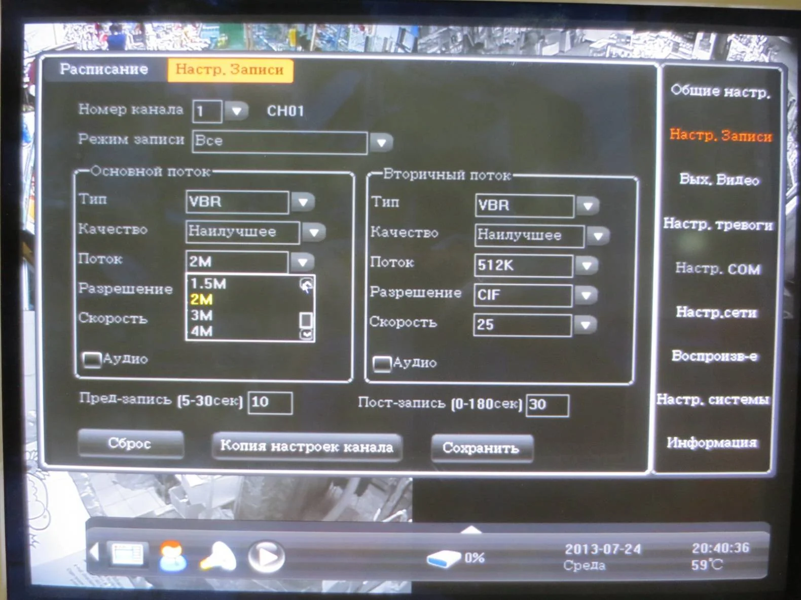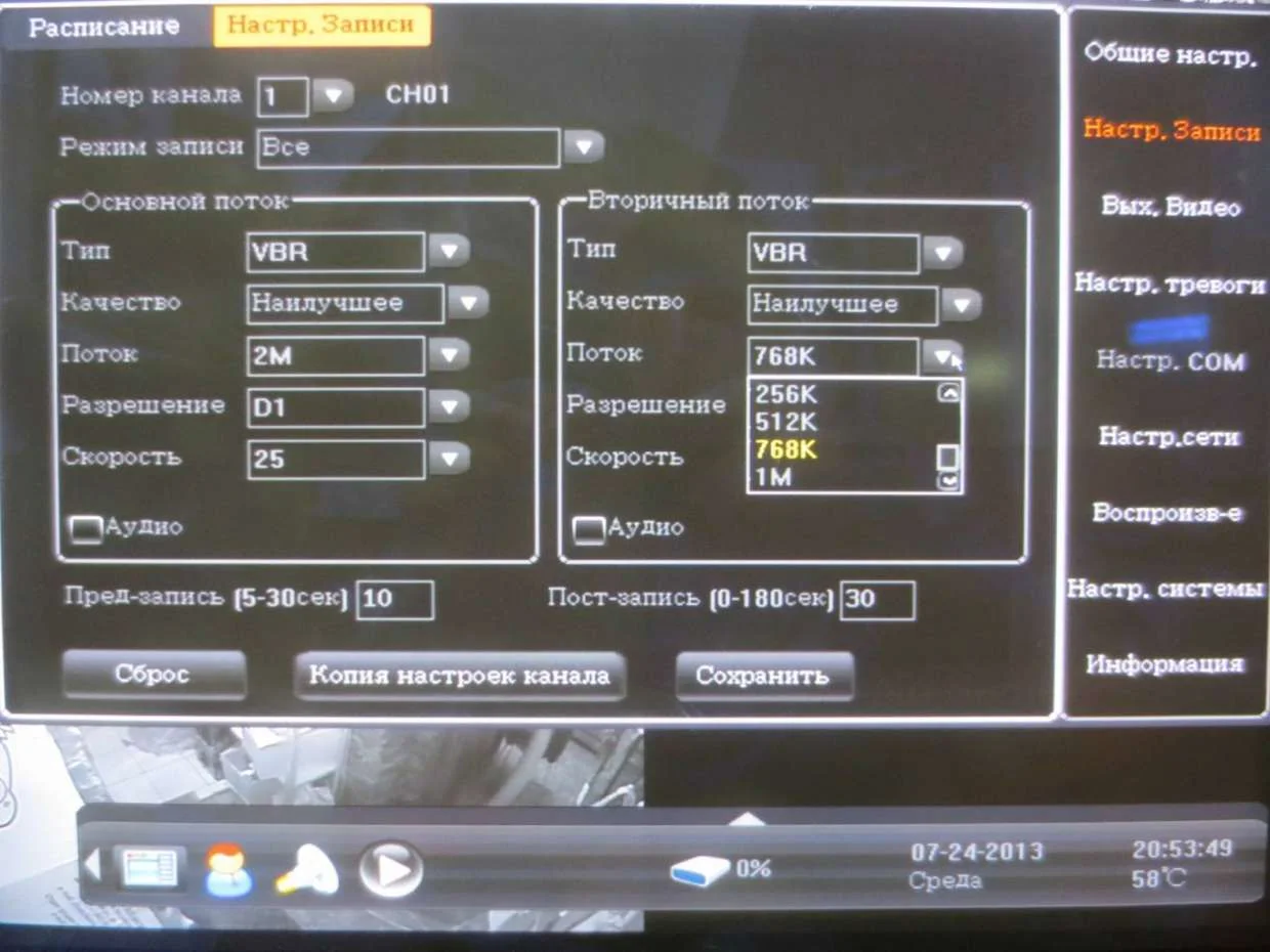3) Когда я в пункте меню "Вторичный поток" устанавливаю "Поток" из выпадающего меню, ставлю его 1М (что видимо означает 1 мегабайт), сохраняю, выхожу из меню, потом опять захожу, а это поле как будто по стандарту может быть максимальным со значением потока 768К. Что за глюк такой может быть? Может регистратор такой впарили непонятный.