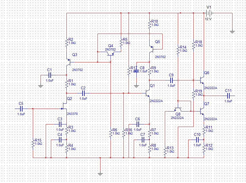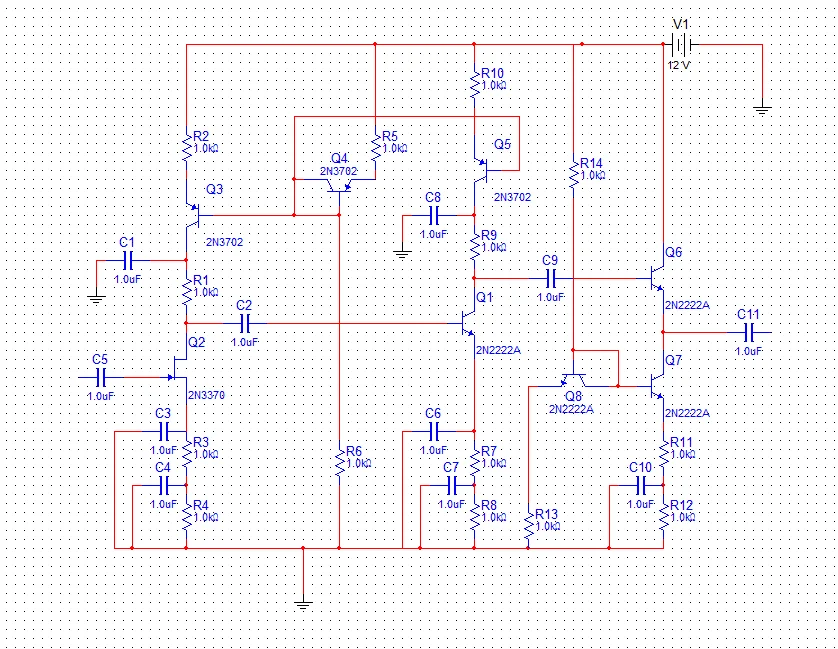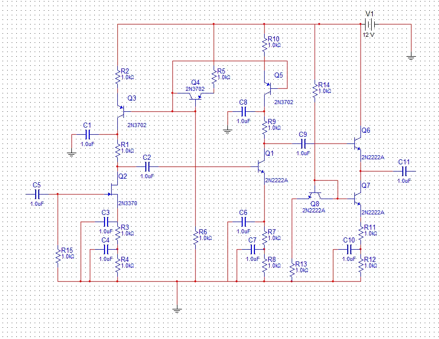 Всем привет. Вчера накидал схему , хочу спросить насколько она будет работоспособна. Это первая в жизни моя схема, так что прошу не судить строго. В конце ещё будет стоять фильтр верхних и нижних частот. Предполагаю с этой схемы выжать К. усиления 1000 с широкой полосой пропускания. Номиналы на схеме не имеют никакого значения (прошу не обращать на них внимания). Если кто поможет с расчётом буду душевно благодарен. Спасибо.