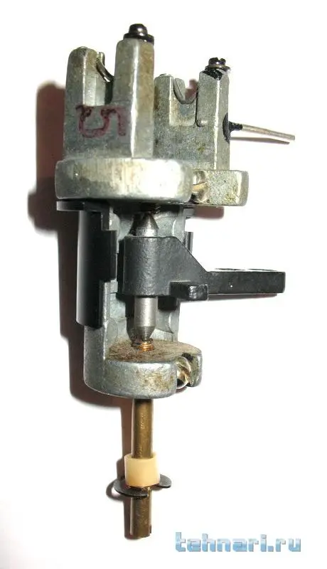 На кончиках цапф имеются камни с конусной ямкой для кончика иглы. Свободное вращение цапф блокируется винтами справа. Открутив немного винты, можно начать крутить цапфы для регулировки зазора, его быть не должно. Лучше крутить только верхнюю. Поджимать цапфы к игле нужно очень осторожно, буквально до легкого касания. Если начать сильно затягивать, то вначале вырастет трение, а затем игла расколет камень.