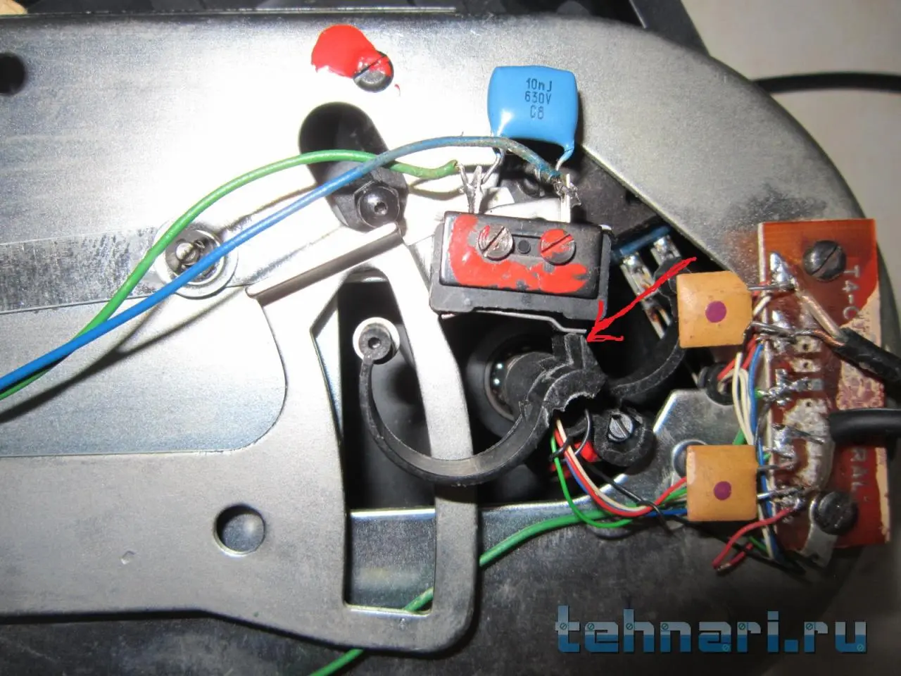 Снял под днищем эту крышку, отвёл тонарм в сторону центра немного, такое ощущение что металлическая пластина конечника немного давит на пластмассовый рычажок - показано стрелкой. Скорей всего из-за того что правая часть конечника немного ниже.