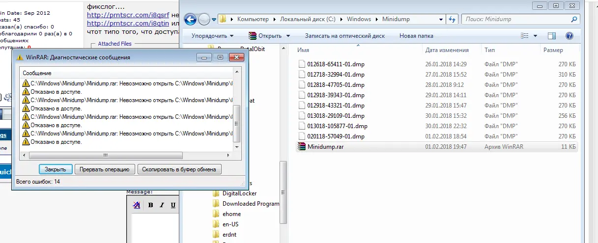 Скачайте и запустите твик реестра. (он в архиве). На запарос о добавлении информации в реестр согласитесь. После чего зайдите в папку Windows. Зажмите правую клавишу Shift и кликните правой кнопкой мыши по папке Minidump. В меню выбрать "Сменить владельца". После чего папку Minidump в архив и сюда.