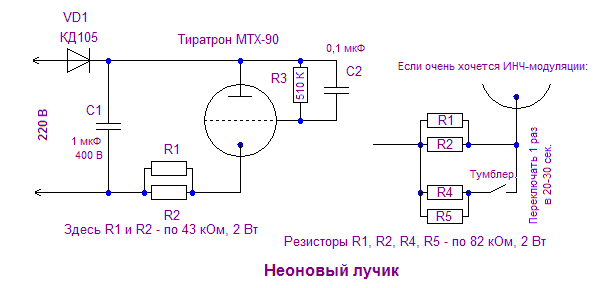 Обнаружил у себя в закромах тиратрон МХТ - 90. Схема подключения простая и имеет всего навсего 6 элементов которые стоят копейки. Что касается самого МХТ -90 - это тиратрон или триод входит в линейку советских индикаторных тиратронов, который к тому же до сих пор используется в некоторых областях техники. Это конечно величайший пример техники безопасности =))) Так как схема простейшая то решил собирать навесом, да лень было делать печатку в 12 часов ночи.