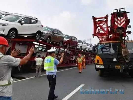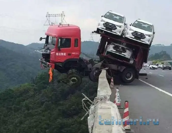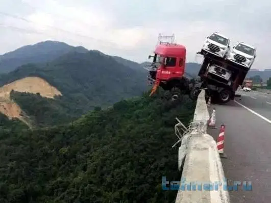 Инцидент произошел на юго-востоке Китая в провинции Гуандун в городе Цинъюань. На фотографиях видно, что передняя часть автовоза зависла над пропастью. Если бы не тяжелая задняя часть трейлера, грузовик не удержался бы. Жизнь водителю спас 21 автомобиль, закрепленный на машине.