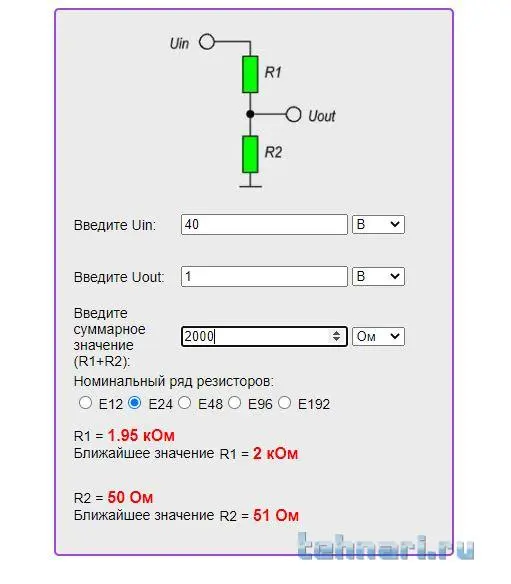 Полезный калькулятор, пригодится: Делитель напряжения на резисторах. Формула расчета, онлайн калькулятор | joyta.ru