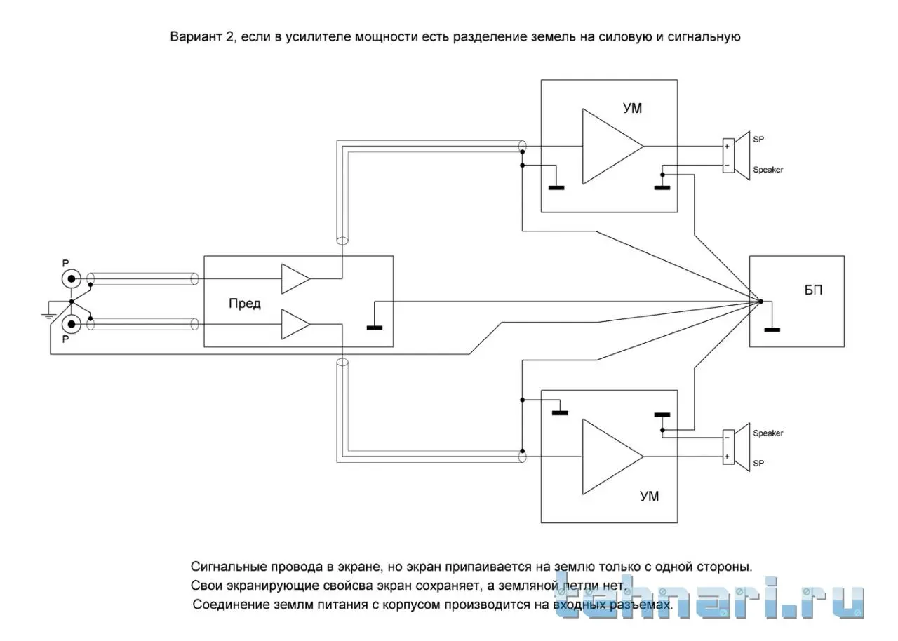 4. Подать сигнал с блока регулировок двумя скрученными проводами, по возможности очень короткими, общий и сигнал соединив их с соответствующими точками на усилителе мощности.