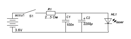 всем привет возник такой вопрос я в электронике не шарю и хочу собрать вот такой лазер как на схеме но нимогу понять к схеме от лазера идут 2 контакта на схему а на самом лазере 3 помогите кто понимает какие контакты надо подключать???
