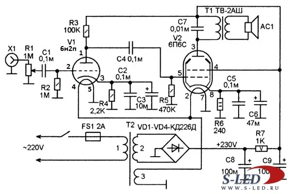 транс подойдет. В моем варианте в качестве выходного использовался ТВК-70лм, это так, для справки. А С4 находится между анодным резистором 6н2п и сеткой 6п6с :),