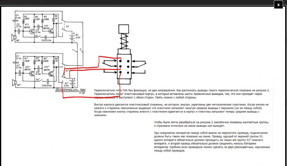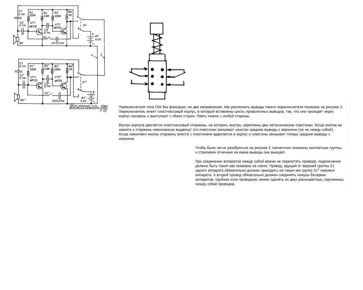 Спасибо за помощь.....сейчас нашел в инете еще одну схемку Переговорного устройства Схема переговорного устройства Паятель.Ру - Все электронные схемы теперь думаю какую собирать.... для этой схемы появился вопрос про выводы кнопки, (а точнее я никак не пойму как обозначены выводы кнопки на схеме и как они соответствуют чертежу самой кнопки) прошу прощения если непонятно написал.... не могли бы вы нарисовать какой к какому выводу идут контакты от кнопки (на чертеже) к контактам на схеме?