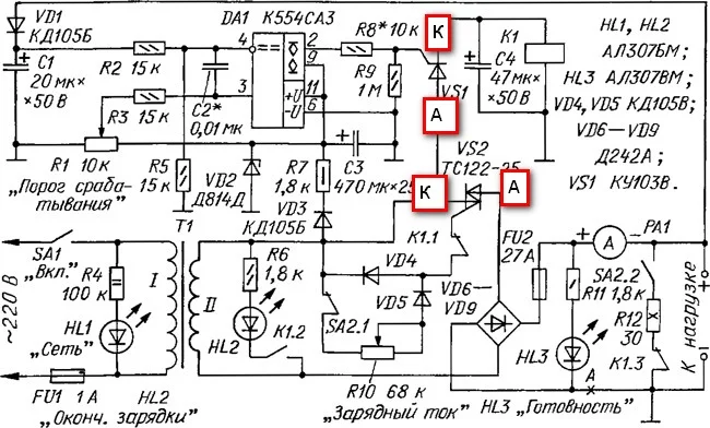 Спасибо! А можете на схеме указать, где у симистора и тиристора анод и катод? У меня всего по одной штуке...