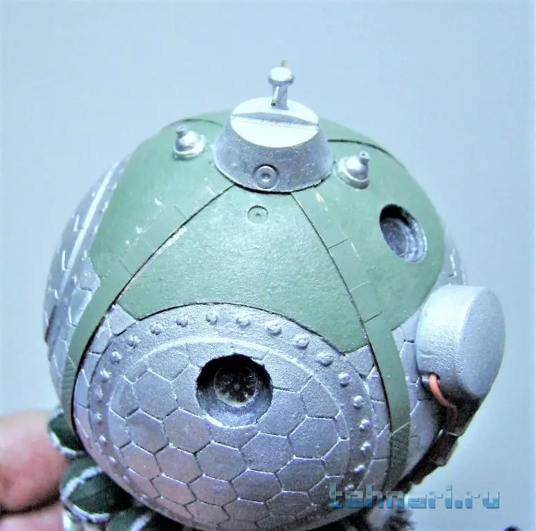Операция завершается приклейкой стяжных лент на поверхность шара и закрепление их концов большой бобышкой с антенной УКВ-связи.