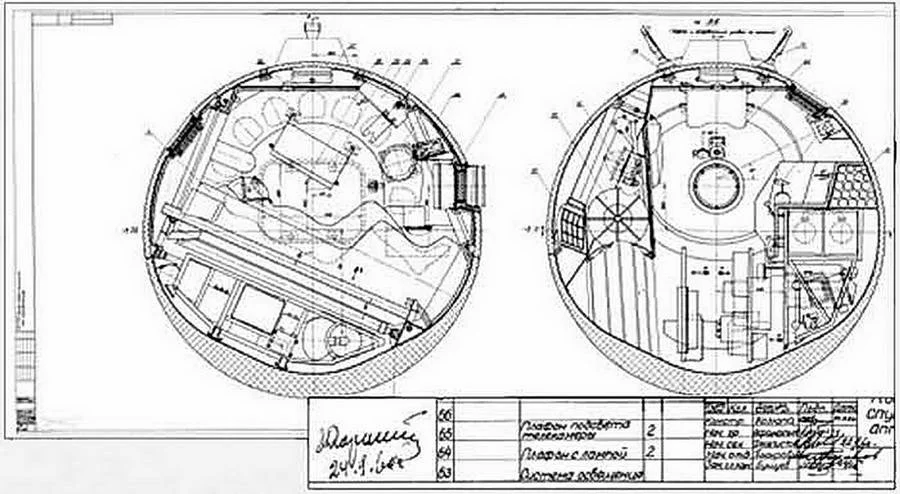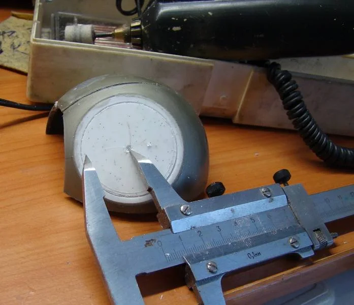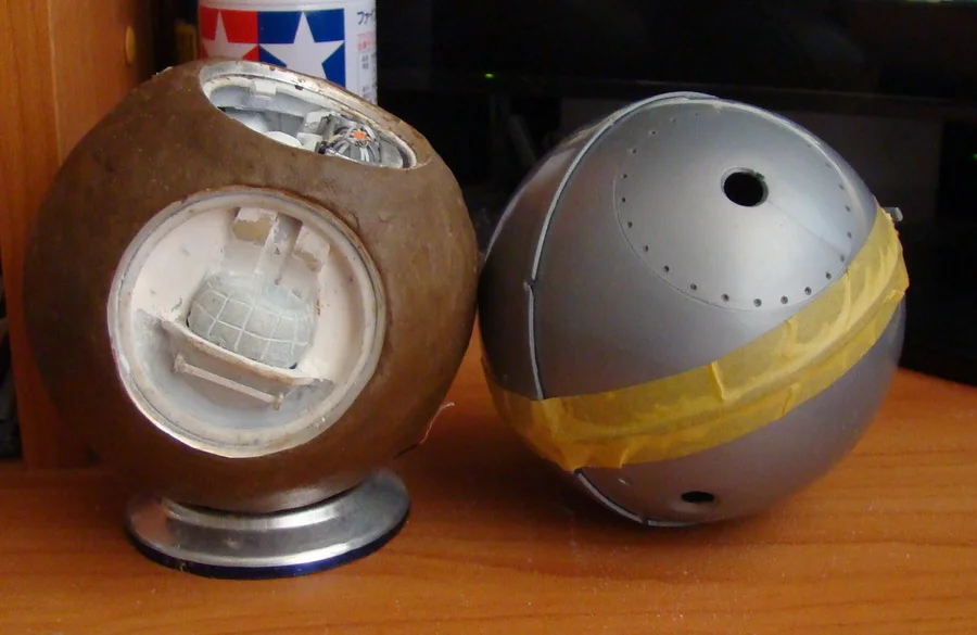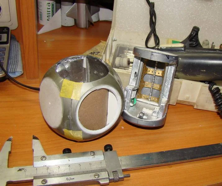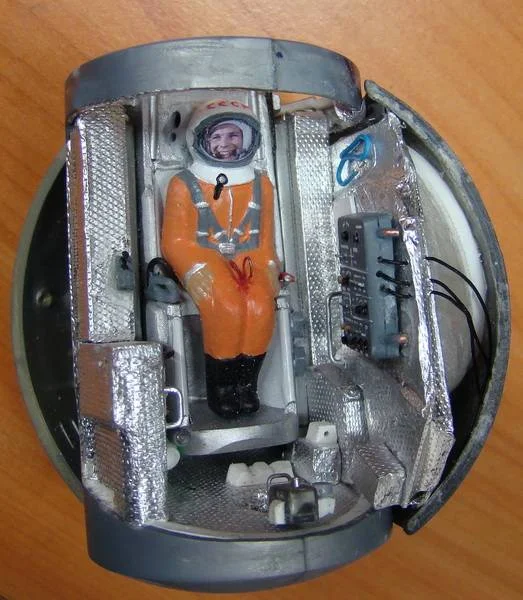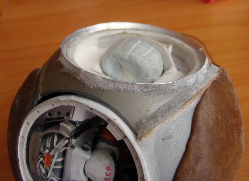 Продолжаю тему "Востока".Из вновь полученных материалов меня в первую очередь заинтересовал парашютный отсек спускаемого аппарата.Фото довольно подробные, на снимке есть и вид аппарата в разрезе , да еще и чертеж.Решил делать данный отсек на модели. Для этого пришлось отчленить от уже склеенных долек корпуса один сектор и к нему приклеить еще одну (четвертую) дольку. В результате получились две половинки корпуса, что облегчает дальнейшие сборочные работы по наполнению объема кабины приборами и покраску. Произвел на приклеенной дольке разметку, по ней вырезал лишние части сверху и снизу корпуса, а затем собрав шар воедино при помощи клейкой ленты, при помощи шлифмашинки обработал края отверстий сверху и снизу корпуса, постоянно прикладывая для более точной подгонки цилиндр с катапультируемым креслом. В заклеенном ранее проеме при помощи штангенциркуля (списанный экземпляр , у которого я заточил измерительные губки для резки пластика) вырезал окно. А впереди большая и интересная работа по заполнению проема данного отсека в соответствии с прилагаемыми фото.