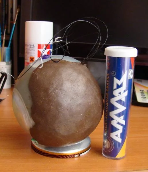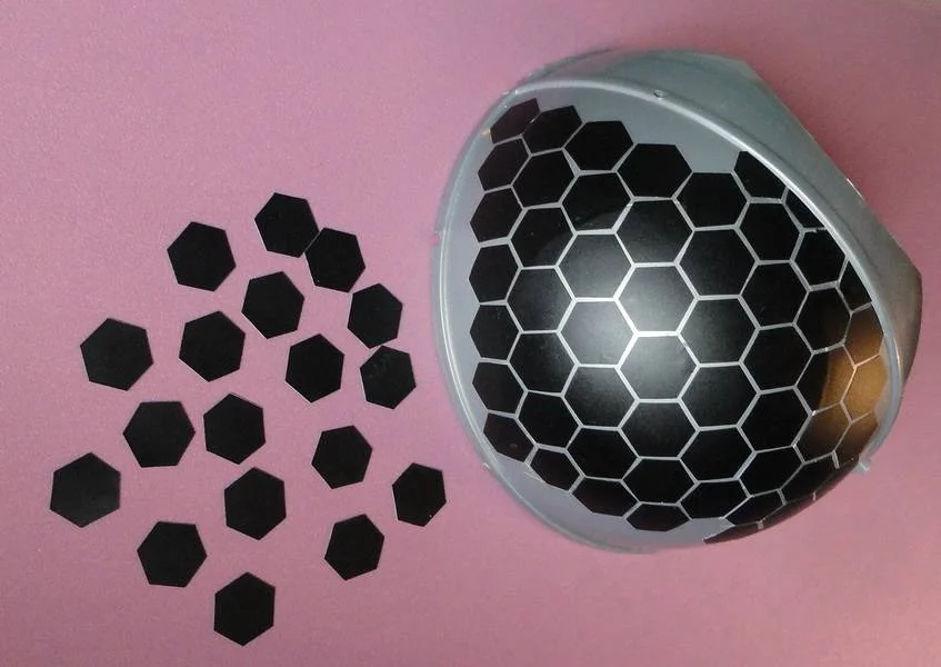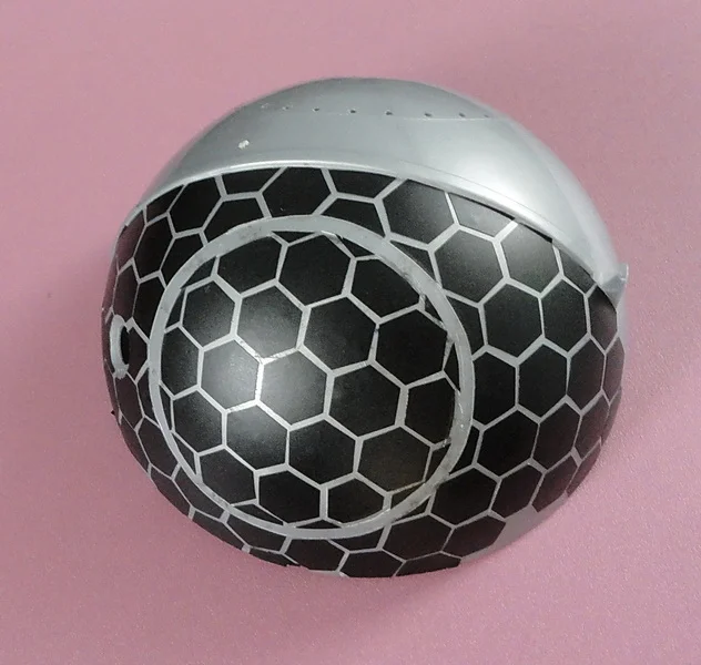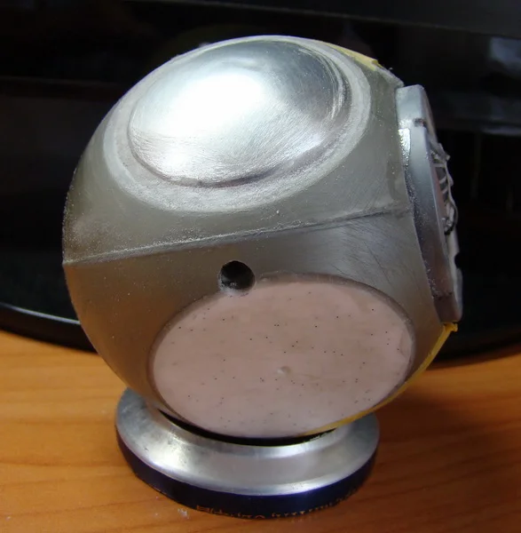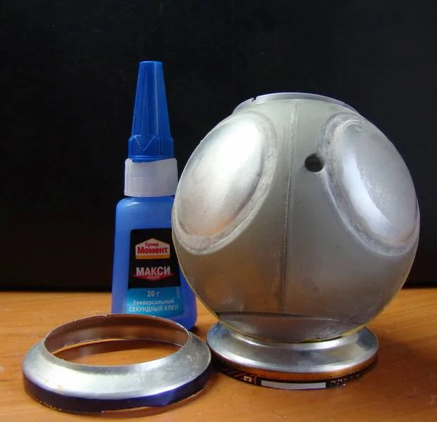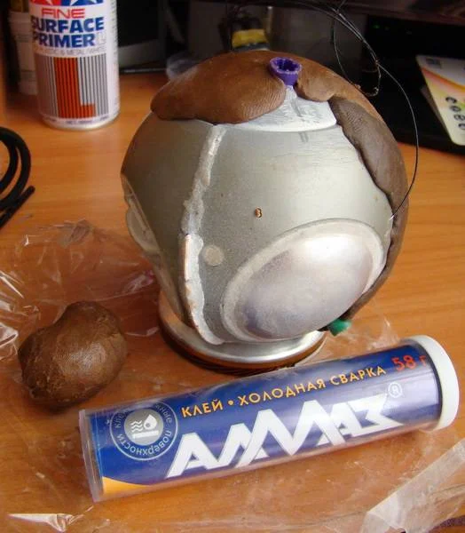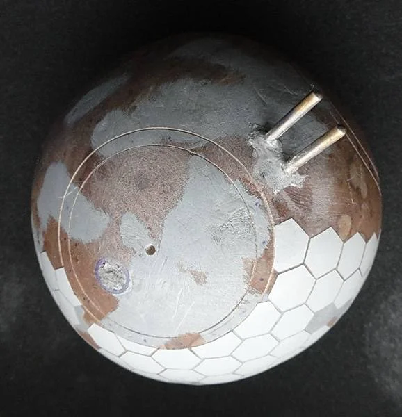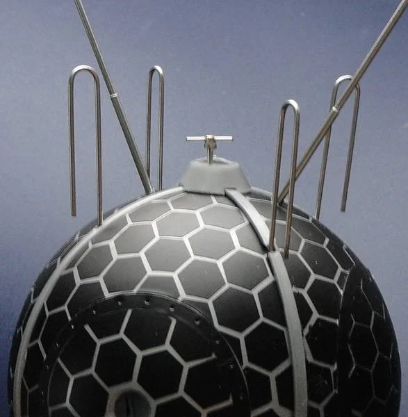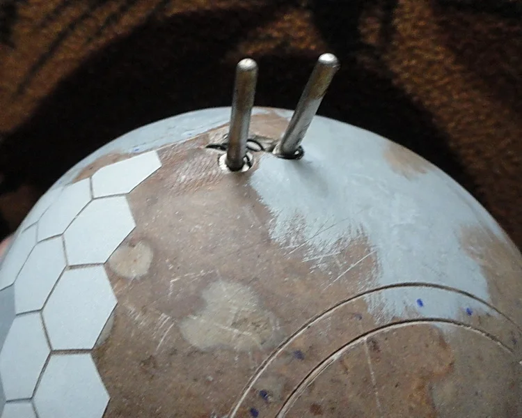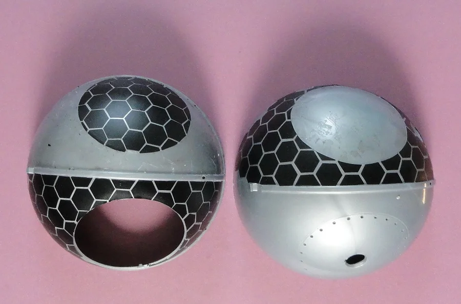 Настало время заняться внешней отделкой шариков спускаемых аппаратов.После выбора вариантов отделки остановился на том,что проще всего будет перенести на ленту с клейкой основой рисунок шестигранника, изображающего термоизолирующую плитку, какими покрыта вся поверхность спускаемого аппарата, а затем вырезать ее и приклеить на корпус модели. В качестве исходного материала взял отходы ленты с клеящим слоем для изготовления дорожных знаков. Рисунок шестигранника наносил посредством шариковой ручки через линейку "Трафарет студенческий".После многократного повторения операции рисования вырезал ножницами шестигранники и занялся кропотливой работой по приклейке их на корпус спускаемого аппарата.Общее количество изготовленных шестигранников для двух корпусов приблизилось к 900 штукам. Кольцевое обрамление крышек люков вырезал из пленки при помощи циркуля-резака.Обработал шкурником корпус спускаемого аппарата с нанесенным слоем шпаклевки, выровнял его до шарообразной формы, а те небольшие углубления, которые остались после вышкуривания, заполнил шпатлевкой "Тамия". После сушки окончательно прошкурил корпус,при помощи резака и штангенциркуля нанес очертания крышек люков, промыл внешнюю поверхность от пыли и занялся переносом на него шестигранников теплозащиты.