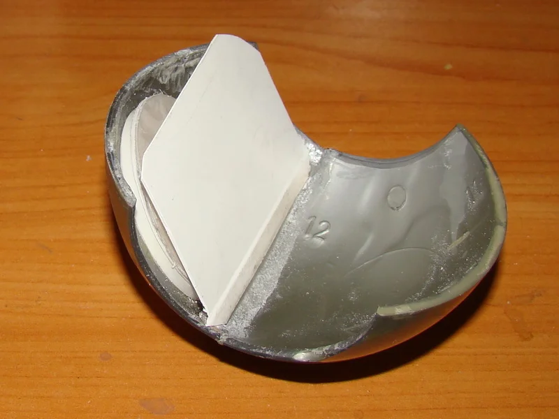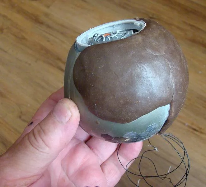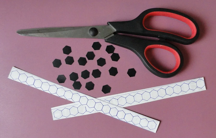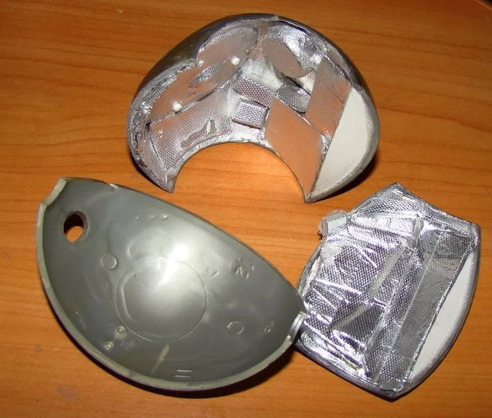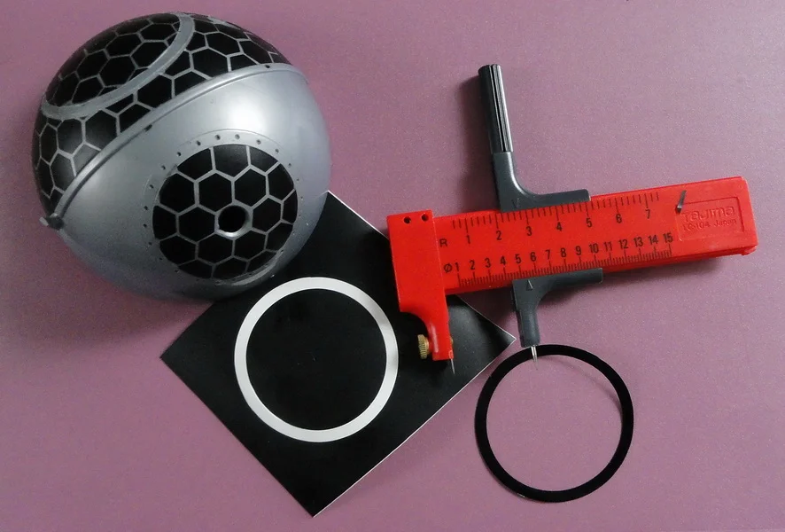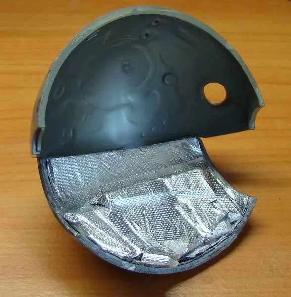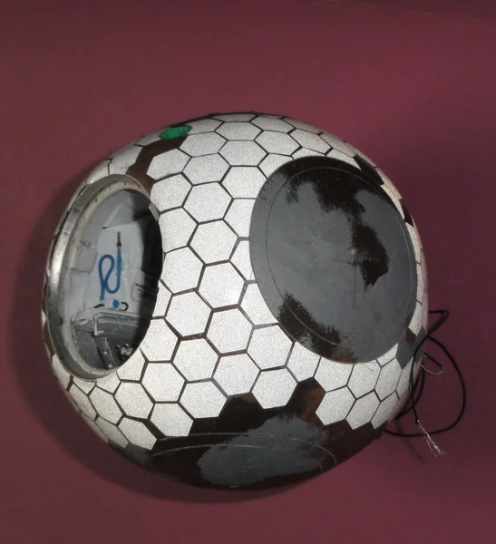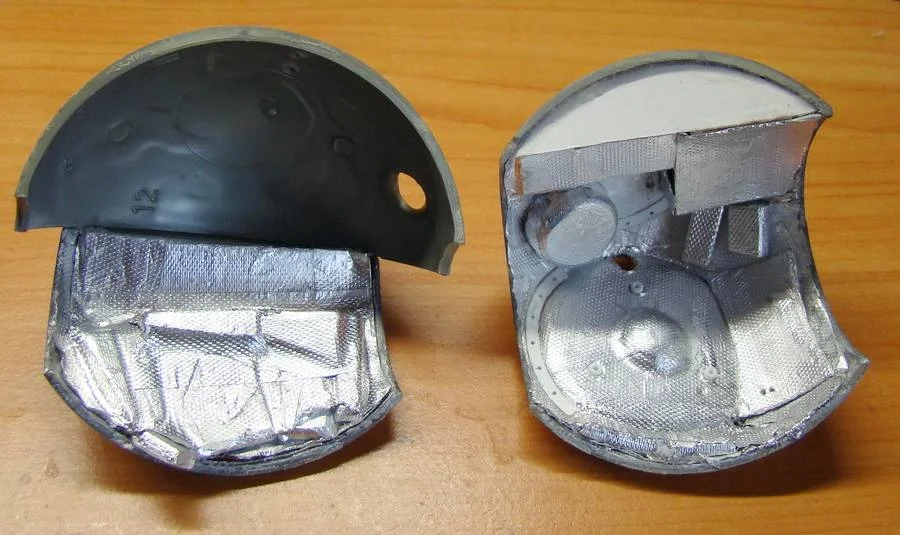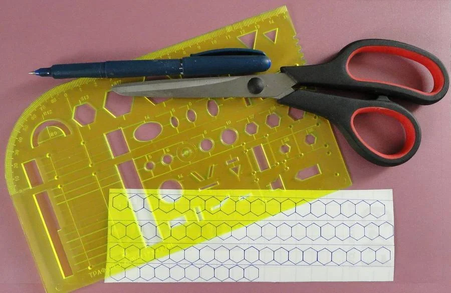 Настало время заняться внешней отделкой шариков спускаемых аппаратов.После выбора вариантов отделки остановился на том,что проще всего будет перенести на ленту с клейкой основой рисунок шестигранника, изображающего термоизолирующую плитку, какими покрыта вся поверхность спускаемого аппарата, а затем вырезать ее и приклеить на корпус модели. В качестве исходного материала взял отходы ленты с клеящим слоем для изготовления дорожных знаков. Рисунок шестигранника наносил посредством шариковой ручки через линейку "Трафарет студенческий".После многократного повторения операции рисования вырезал ножницами шестигранники и занялся кропотливой работой по приклейке их на корпус спускаемого аппарата.Общее количество изготовленных шестигранников для двух корпусов приблизилось к 900 штукам. Кольцевое обрамление крышек люков вырезал из пленки при помощи циркуля-резака.Обработал шкурником корпус спускаемого аппарата с нанесенным слоем шпаклевки, выровнял его до шарообразной формы, а те небольшие углубления, которые остались после вышкуривания, заполнил шпатлевкой "Тамия". После сушки окончательно прошкурил корпус,при помощи резака и штангенциркуля нанес очертания крышек люков, промыл внешнюю поверхность от пыли и занялся переносом на него шестигранников теплозащиты.