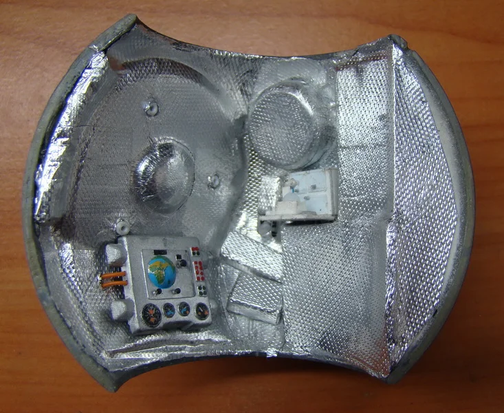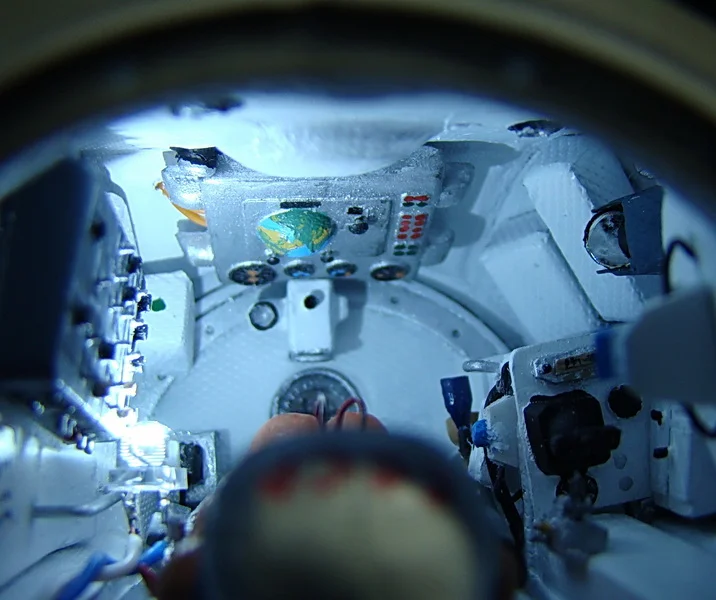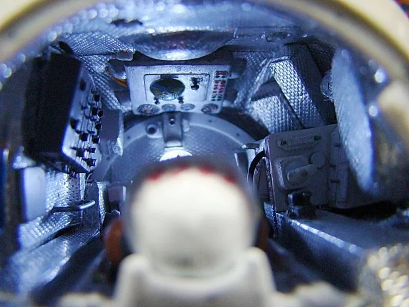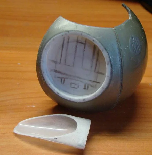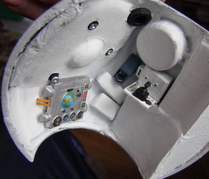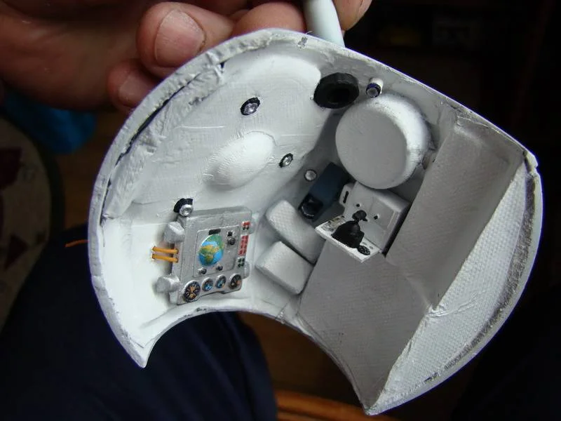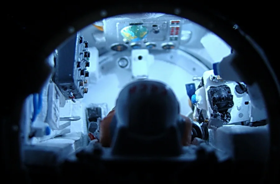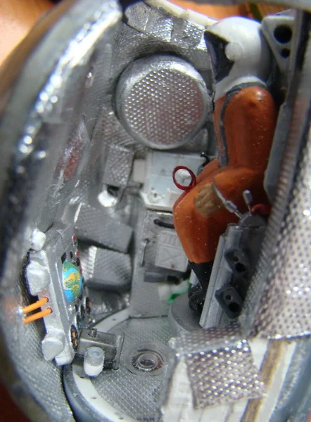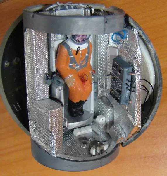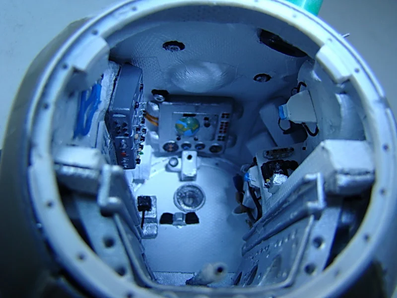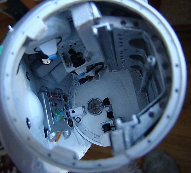 Продолжаю работу по парашютному отсеку спускаемого аппарата. Для начала удалил старую (ранее приклеенную) перегородку. Затем из листового пластика склеил кольцо и вклеил его в проем люка. Из листового пластика вырезал заднюю стенку проема и приклеил ее к кольцу.Внутри корпуса вклеил перегородку, отделяющую космонавта от парашютного отсека. Для изготовления контейнера парашюта спускаемого аппарата взял корпус 20 мл шприца, вырезал из него трубку, из листового пластика вырезал элипсовидное дно и вклеил его в деформированную заранее трубку на цианокриле.Прочертив на задней стенке проема элементы конструкции, которые будут устанавливаться позднее, наметил контур выреза под контейнер для хранения парашюта,вырезал при помощи ножа и микропилки проем, а также произвел обрезку трубки от шприца, придав ей окончательную форму контейнера.Затем при помощи цианокрила произвел склейку деталей, сдобрив клеевой шов питьевой содой (натрием двууглекислым) в качестве наполнителя и полимеризатора клея. Напоследок, после полимеризации клея, осталось немного поработать шкуркой и выровнять некоторые неровности клеевого шва. Работа понемногу продолжается...