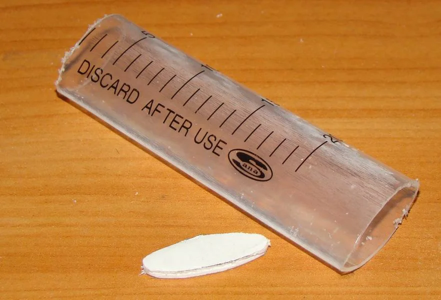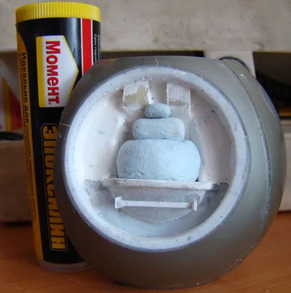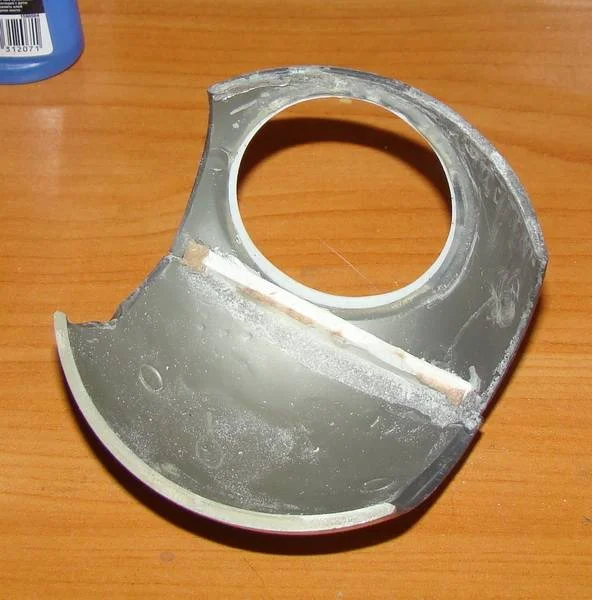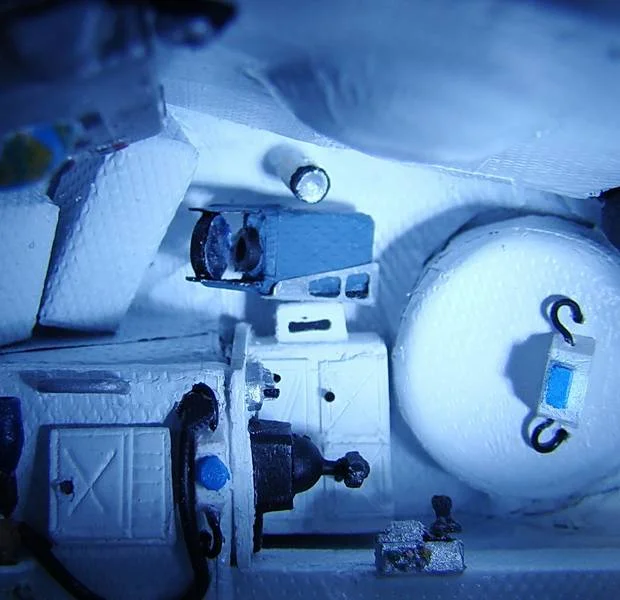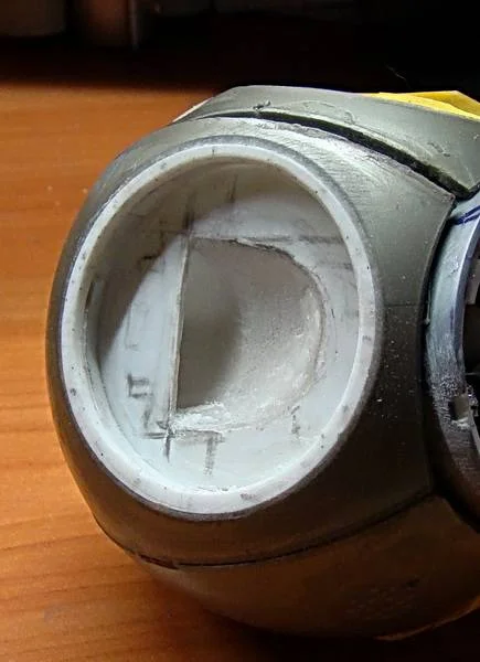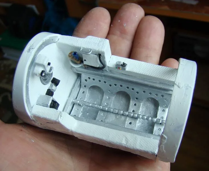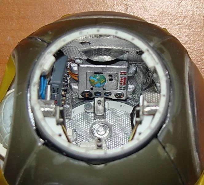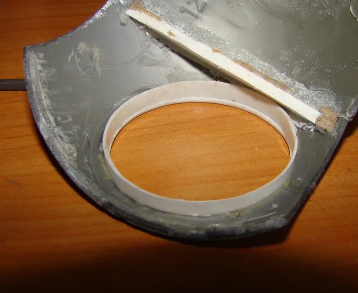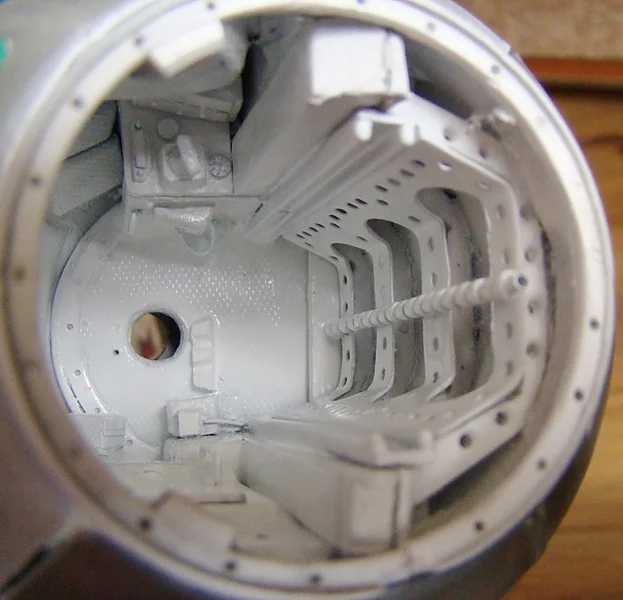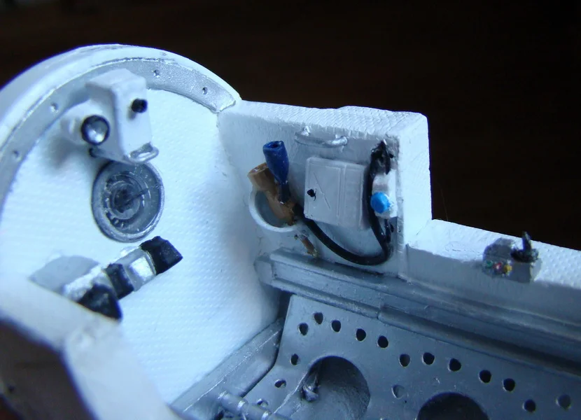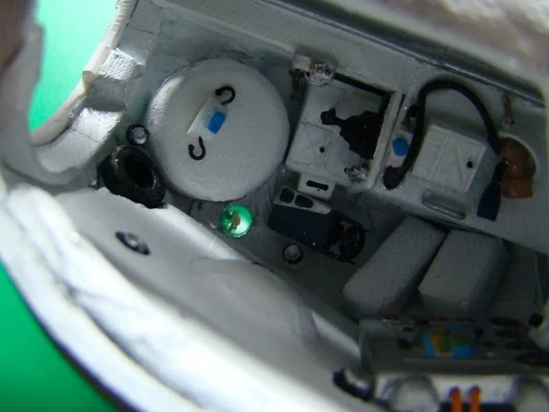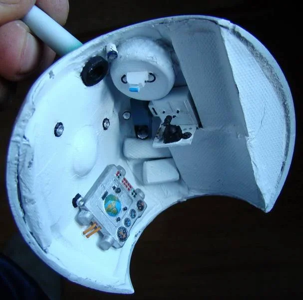 Продолжаю работу по парашютному отсеку спускаемого аппарата. Для начала удалил старую (ранее приклеенную) перегородку. Затем из листового пластика склеил кольцо и вклеил его в проем люка. Из листового пластика вырезал заднюю стенку проема и приклеил ее к кольцу.Внутри корпуса вклеил перегородку, отделяющую космонавта от парашютного отсека. Для изготовления контейнера парашюта спускаемого аппарата взял корпус 20 мл шприца, вырезал из него трубку, из листового пластика вырезал элипсовидное дно и вклеил его в деформированную заранее трубку на цианокриле.Прочертив на задней стенке проема элементы конструкции, которые будут устанавливаться позднее, наметил контур выреза под контейнер для хранения парашюта,вырезал при помощи ножа и микропилки проем, а также произвел обрезку трубки от шприца, придав ей окончательную форму контейнера.Затем при помощи цианокрила произвел склейку деталей, сдобрив клеевой шов питьевой содой (натрием двууглекислым) в качестве наполнителя и полимеризатора клея. Напоследок, после полимеризации клея, осталось немного поработать шкуркой и выровнять некоторые неровности клеевого шва. Работа понемногу продолжается...