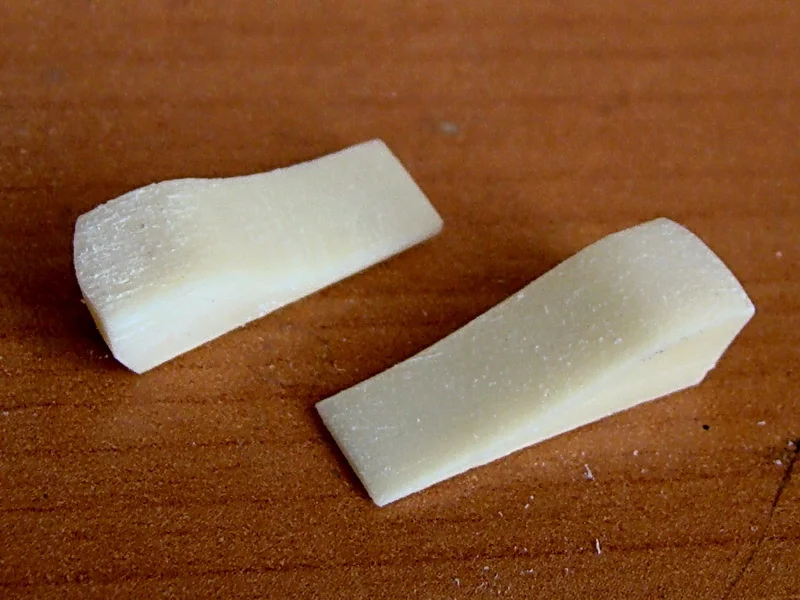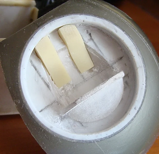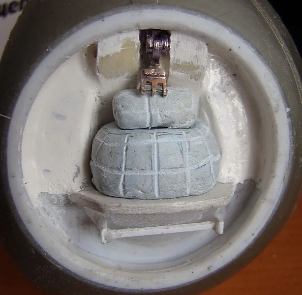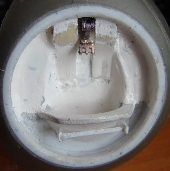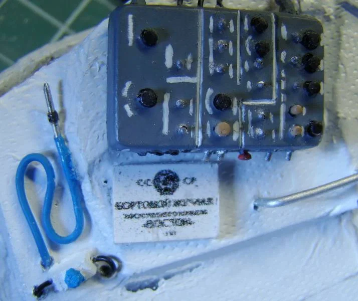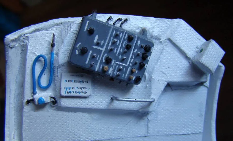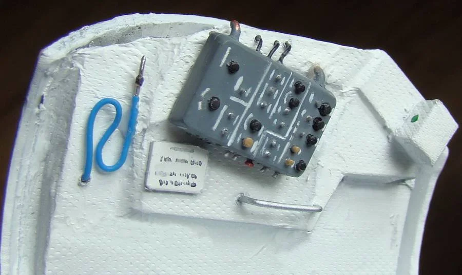 Ориентируясь на вышеприведенные фото внешнего вида парашютного отсека спускаемого аппарата КК "Восток", продолжаю его изготовление в модели.Под полкой вскрыл ножом и обработал бором серповидное окно, которое затем заклеил серповидным сегментом, изображающим наружную стенку отсека основного парашюта спускаемого аппарата. В задней стенке отсека бором выбрал пазы, в которые установил направляющие для парашютной системы, изготовленные из обрезков полиуретановой смолы.После приклейки направляющих немного прошелся по щелям шпаклевкой - вид получился не очень, но это не страшно, все еще будет подвергнуто ошкуриванию. Под полкой приклеил перемычку, для чего предназначена , не знаю, но на фото Гагаринского спускаемого аппарата она есть в наличии. Из "Эпоксилина" вылепил муляжи основного, тормозного и вытяжного парашютов спускаемого аппарата. После покраски изготовлю для них строповую обвязку и уложу в контейнер.