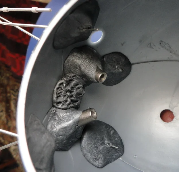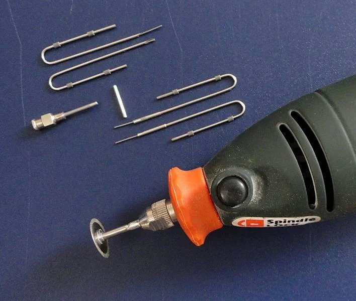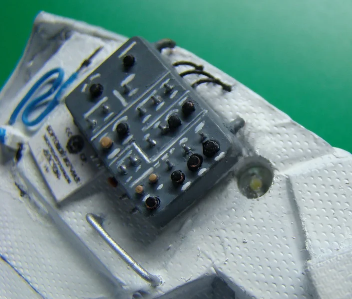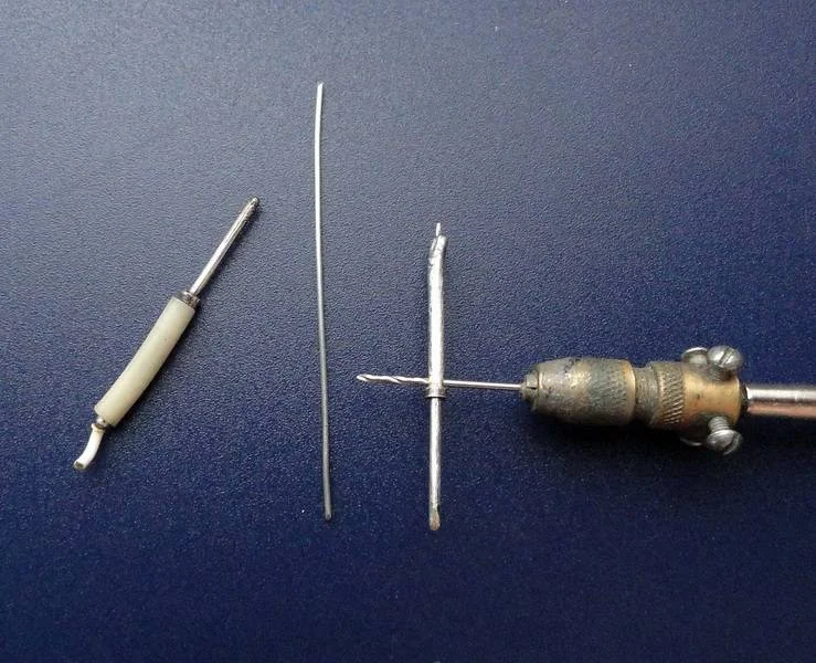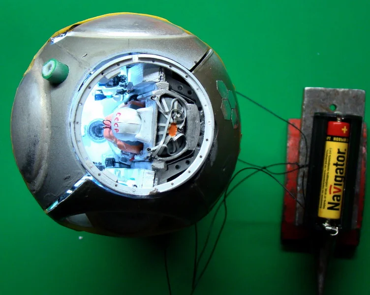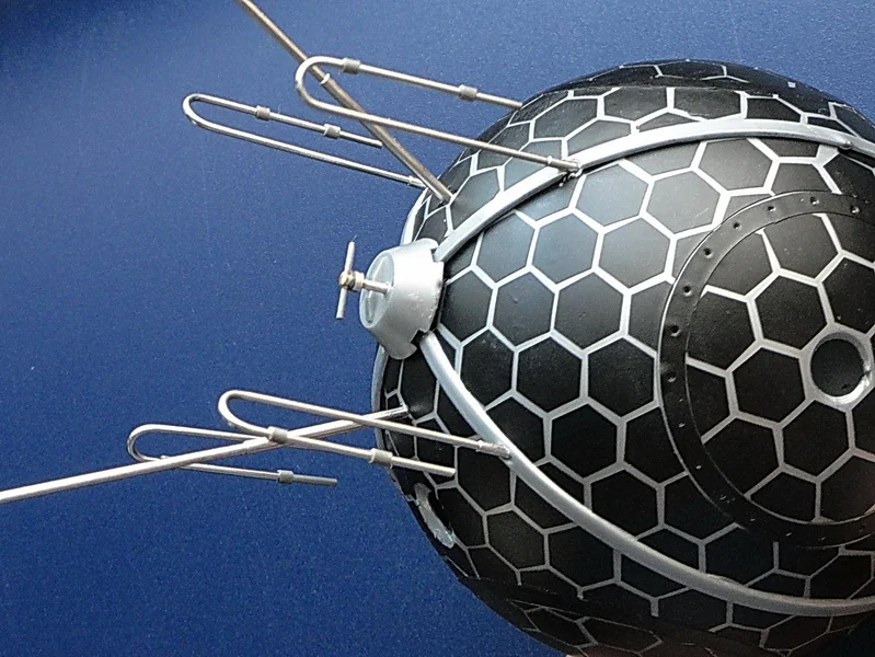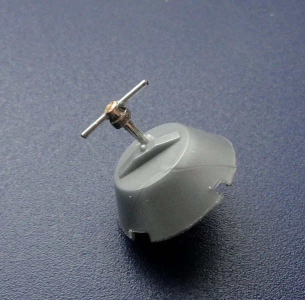 В перерывах между работой на дачном участке продолжаю вырезать и клеить шестигранники теплозащиты и параллельно изготовил антенное хозяйство спускаемого аппарата. Антенны радиосвязи на корабле были ленточного типа (наподобие полотна измерительной рулетки) и разворачивались во всю длину по команде при достижении кораблем зоны безвоздушного пространства.Поскольку повторить их в модели сложно, изготовил данные антены из набора инъекционных игл разного диаметра и проволоки.Т-образная антенна системы "Сигнал"входит в комплект деталей модели, но я заменил ее на самодельную для предотвращения случайной поломки в дальнейшем. Штырь антенны выполнил из ножки от разъема "ШР", просверлил его и вставил в отверстие вибратор антенны, выполненный из проволоки. Затем, после отрезки, всю конструкцию установил на головку блока электронной аппаратуры. Гнутые антенны системы командной радиосвязи изготовил из инъекционной иглы Ф 1,2мм. Усиливающие накладки и установочные стойки изготовил из иглы Ф1,6мм, нарезав заготовки алмазным диском при помощи шлифмашинки. Гибку иглы производил при помощи круглогубцев.Для сохранения геометрии иглы при гибке и предотвращения ее деформации ввел в нее проволоку соответствующего диаметра. Затем просверлил в корпусе отверстия, установил антенны, изнутри основания антенн закрепил нашлепками из "холодной сварки". Выходящие из корпуса выводные концы системы внутреннего освещения кабины припаял к ножкам от разъема "ШР", которые затем вклеил в корпус. В дальнейшем данные ножки будут являться точкой опоры для "шарика" и заодно, проводниками эл. тока к светодиодам.