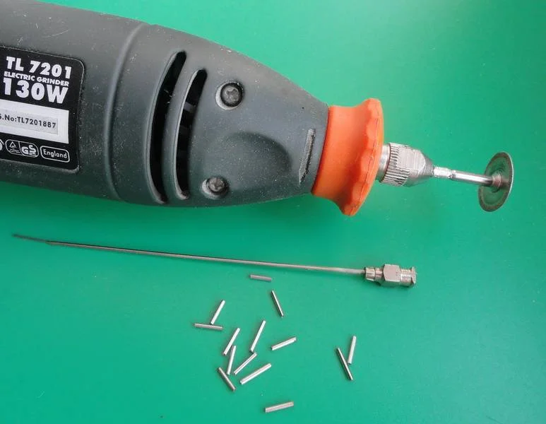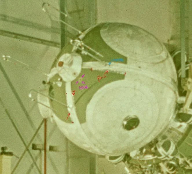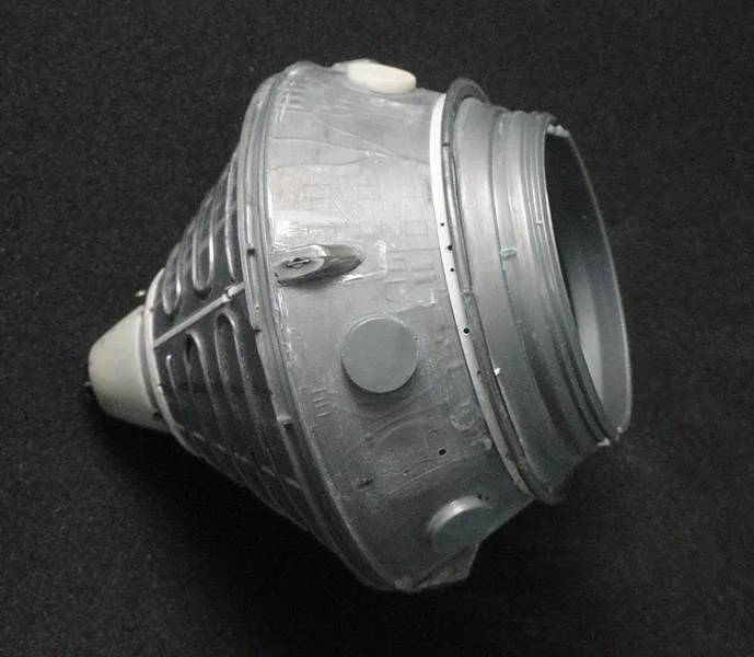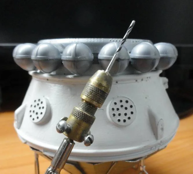 По различным фото внешнего вида СА из музеев доработал кабель-мачту, соединяющую СА с приборным отсеком - добавил пару проводников с обеих сторон канала кабель-мачты и закрепил их ленточками алюминиевой фольги-самоклейки. Затем взялся за доработку баллонов высокого давления со сжатыми газами - воздухом, кислородом, азотом. Перво-наперво немного соскоблил выступающие места лент крепления баллонов, затем задул деталь грунтом "Тамия" и после сушки, эмалью-серебрянкой. Баллоны в зеленый цвет красил акриловой краской при помощи кисти. Крепление баллонов к корпусу приборного отсека производилось стяжными лентами, под которые подкладывались прокладки. Прокладки белого цвета изготовил из ПХВ-ленты с клеящим слоем , а поверх них наклеил стяжные ленты, изготовленные из алюминиевой фольги с клеящим слоем. Штуцера для присоединения трубопроводов к баллонам изготовил из инъекционных игл, нарезав заготовки при помощи шлифмашинки и алмазного диска. Затем просверлив в баллонах отверстия вклеил в них отрезки иглы. Трубопроводы с витыми компенсаторами линейного удлинения изготовил из проволоки, для чего из подручных материалов ( трубки от антенны и обрезков игл) изготовил простейшую оправку для навивки. Вклеил трубопроводы одним концом , тот что с компенсатором, в штуцера, а свободные концы будут разводиться по корпусу приборного отсека, согласно снимков его внешнего вида.