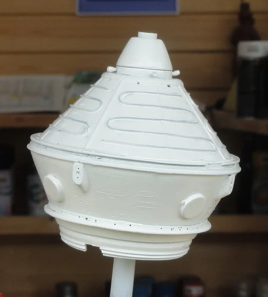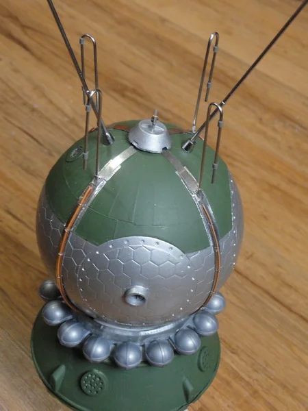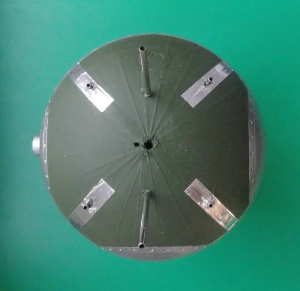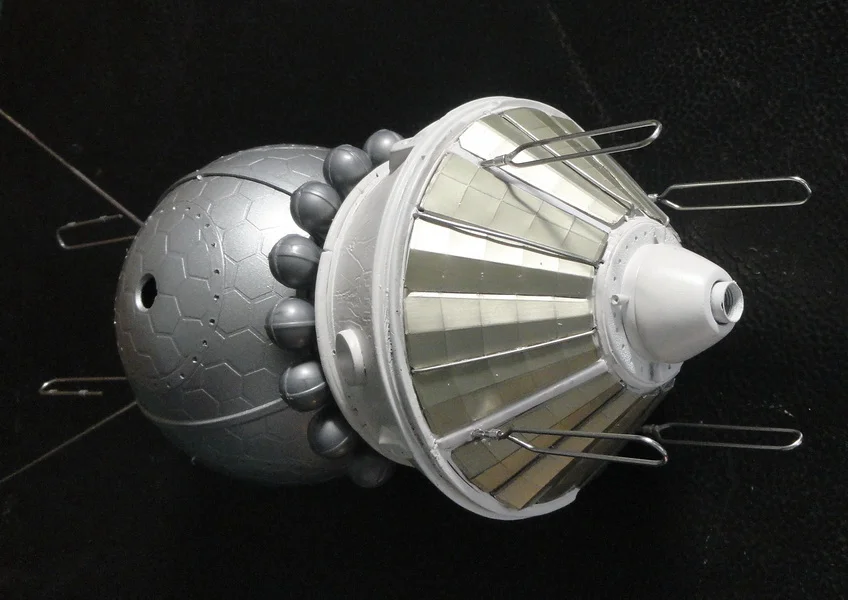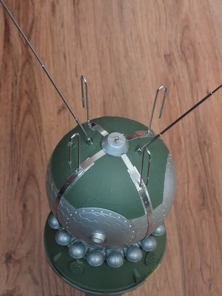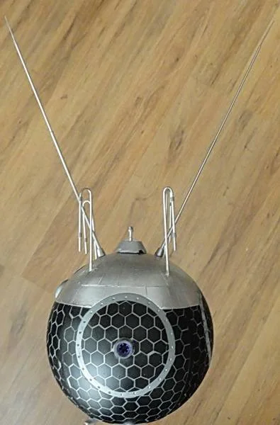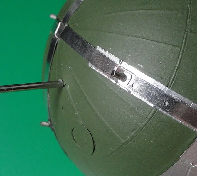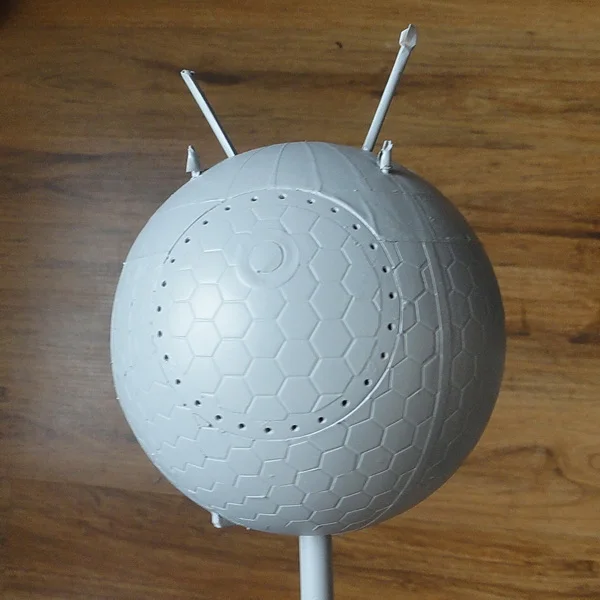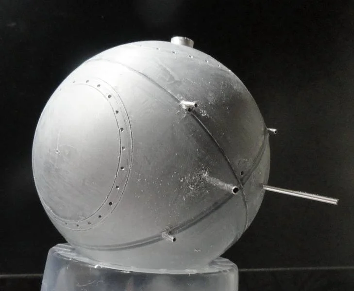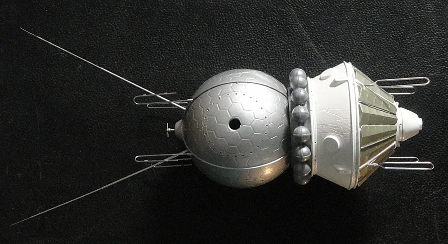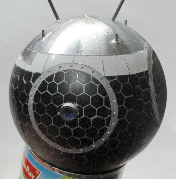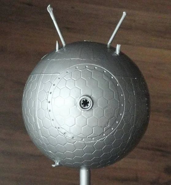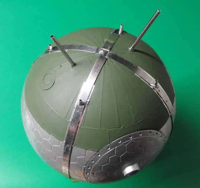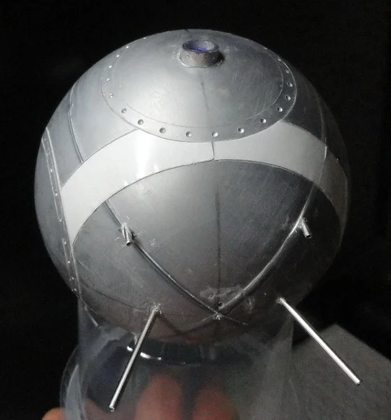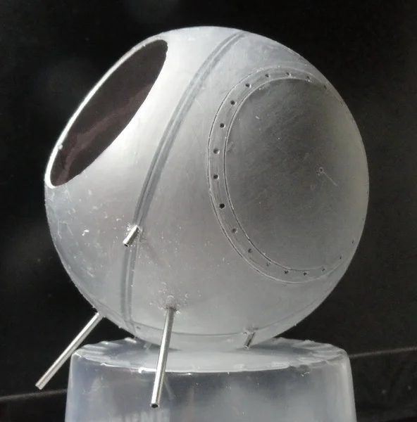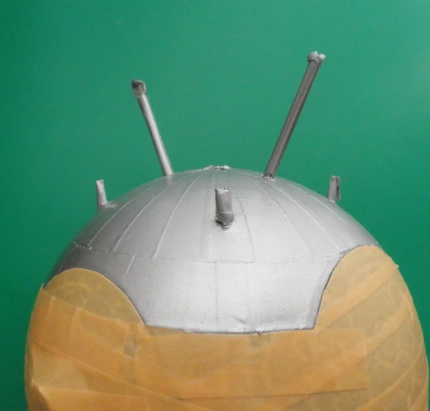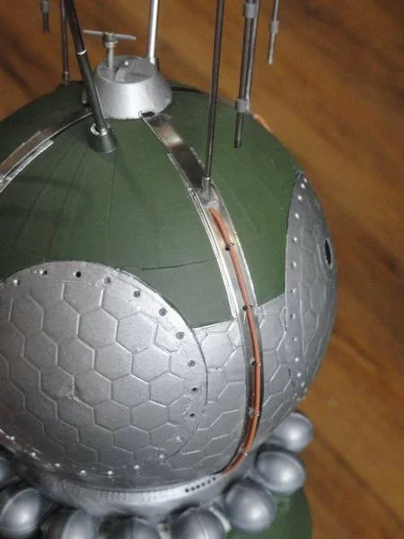 Работа потихоньку-помаленьку продвигается вперед. Посмотрел на то, что установил ранее на приборный отсек и решил все снять и начать изнова. Срезал установленное оборудование, зачистил поверхность шкуркой и покрыл поверхность белой грунтовкой. Поверхность спускаемого аппарата покрыл эмалью под "серебро". Соединил посредством телескопического разъема, изготовленного из трубок от фломастеров, спускаемый аппарат и приборный отсек.Установил на приборный отсек панели системы терморегулирования. Приобрел несколько комплектов длиных инъекционных игл и занялся изготовлением антенн.Круглогубцами нагнул петлеобразные антенны, расположенные на приборном отсеке , а также изготовил два комплекта иммитаторов ленточных антенн, расположенных на приборном отсеке и защитном кожухе тормозного двигателя. Просверлил в корпусе отверстия и установил в них антенны, после чего КК "Восток" стал несколько походить на морского ежа.