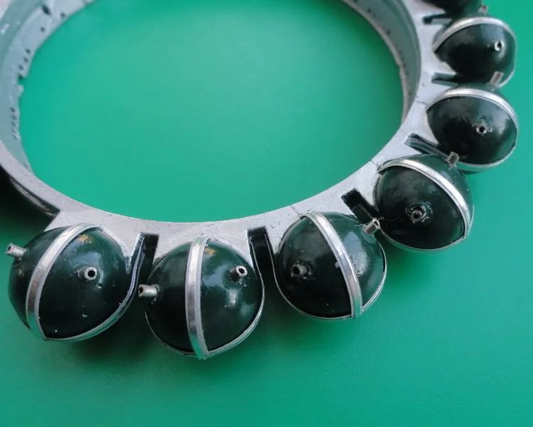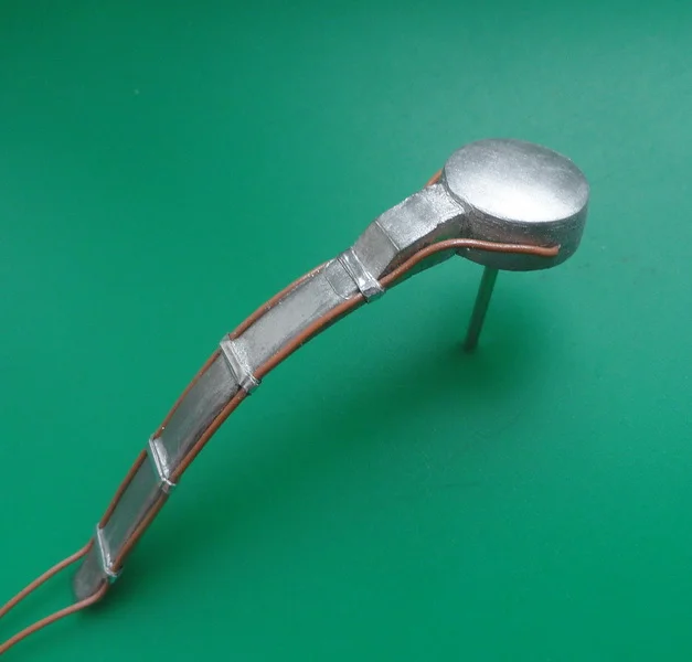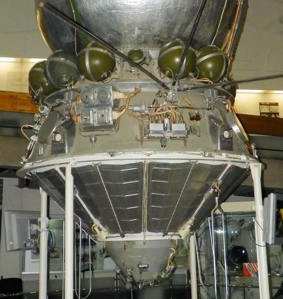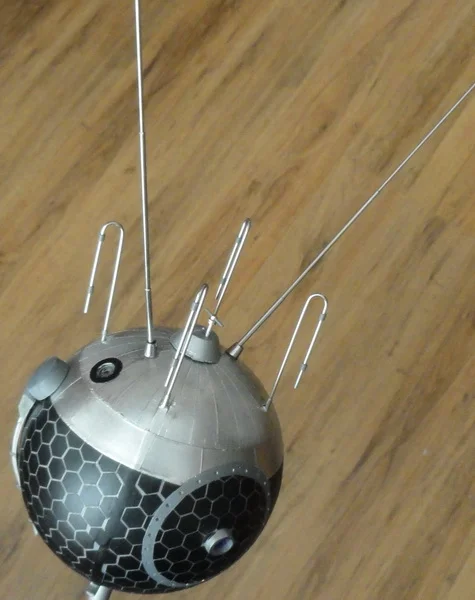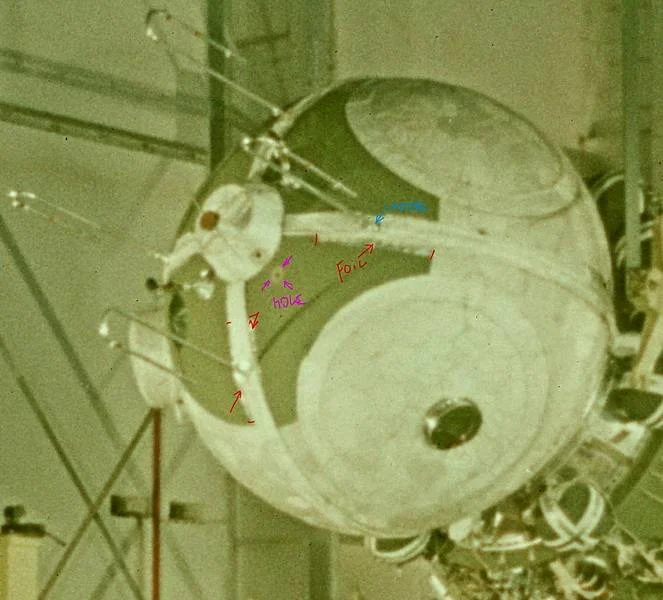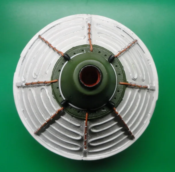 Получилась вот такая картинка. На фото СА одного из "Востоков", находящегося в музее космонавтики в Калуге видно, что по стяжным лентам проложена фидера к антеннам системы командных радиолиний, закрепленным на этих же лентах. В качестве фидера я взял проводники соответствующей расцветки из витой пары сетевого кабеля. Скобы крепления нагнул из проволоки, нарезал бокорезами в размер, а затем аккуратно проотянул проводники по стяжным лентам, закрепляя их в заранее высверленных отверстиях скобками , смазанными цианокрилом. Что из этого вышло, видно на снимке.