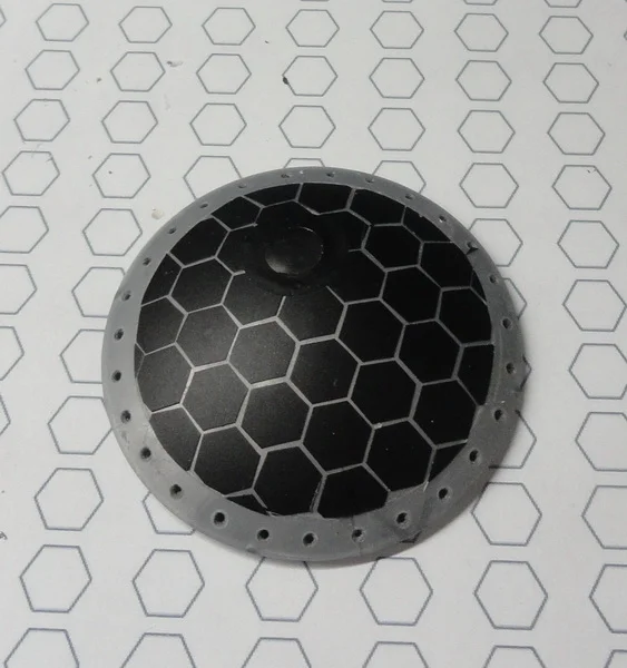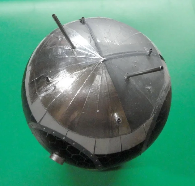 Нашел в сети снимок кальки с чертежами спускаемого аппарата 3КА (к этой серии относится и Гагаринский "Восток"), где ясно видно расположение экрана из алюминия, а в техтребованиях чертежа оговорены требования и исполнительная документация по пайке листов экрана.Руководствуясь полученными сведениями, снял с корпуса СА все ранее наклеенное термозащитное покрытие, зачистил поверхность от остатков клея. Заодно сточил в "0" кольцевые выступы, иммитирующие стяжные ленты (буду делать их накладными, как на настоящем корабле) , прорезал канавки, показывающие расположение люков и отверстия на люках под крепежные болты. Для облегчения процесса обклеивания нанес на корпус карандашом осевые линии, а затем приклеил нижний ряд экрана. Следующим этапом стала наклейка по осевой линии вырезанных шестигранников термозащиты. А уже от этой полосы началась приклейка шестигранников в обе стороны. Как говорил М.С. Горбачев "Процесс пошел...":trio: