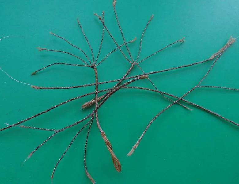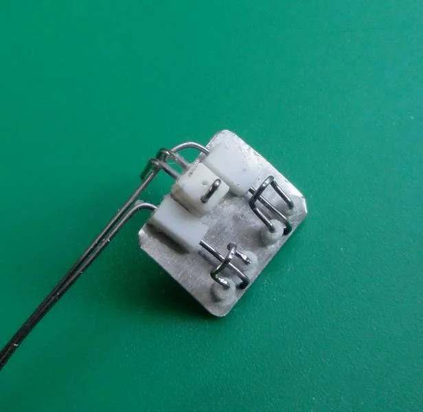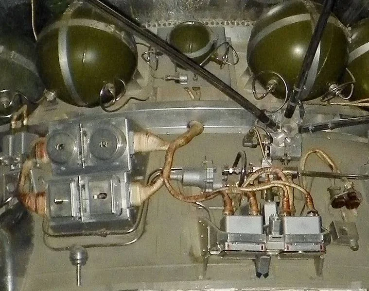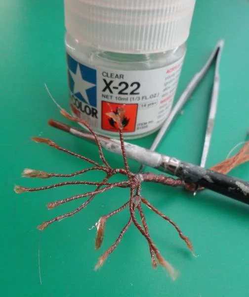 Готовые заготовки жгутов электрокабелей покрываю прозрачным лаком "ТАМИЯ" Х-22 для закрепления ворса. Для иммитации корпусов разъемов ШР нарезал алмазным кругом из инъекционной иглы Ф 1,6мм заготовки длиной по 5мм, под них в корпусе приборного отсека на панелях рассверлил отверстия по диаметру иглы. В данные отверстия вставил отрезки иглы, выставил их по высоте и весь пакет закрепил цианокрилом с внутренней стороны корпуса приборного отсека.Точно таким же образом делаются и остальные панели. Для придания внешней схожести с корпусами ШР покрасил выступающие над панелью части игл в черный цвет. "Стволы" просохших заготовок жгутов укрепил на корпусе , а "ветви" распределил по отверстиям в иглах. Что из этого получилось, видно на снимках. Вроде бы несколько похоже на то, что мы видели на снимке реального приборного отсека.