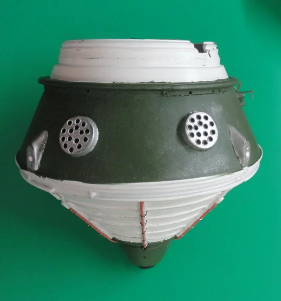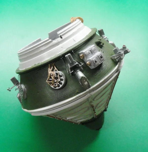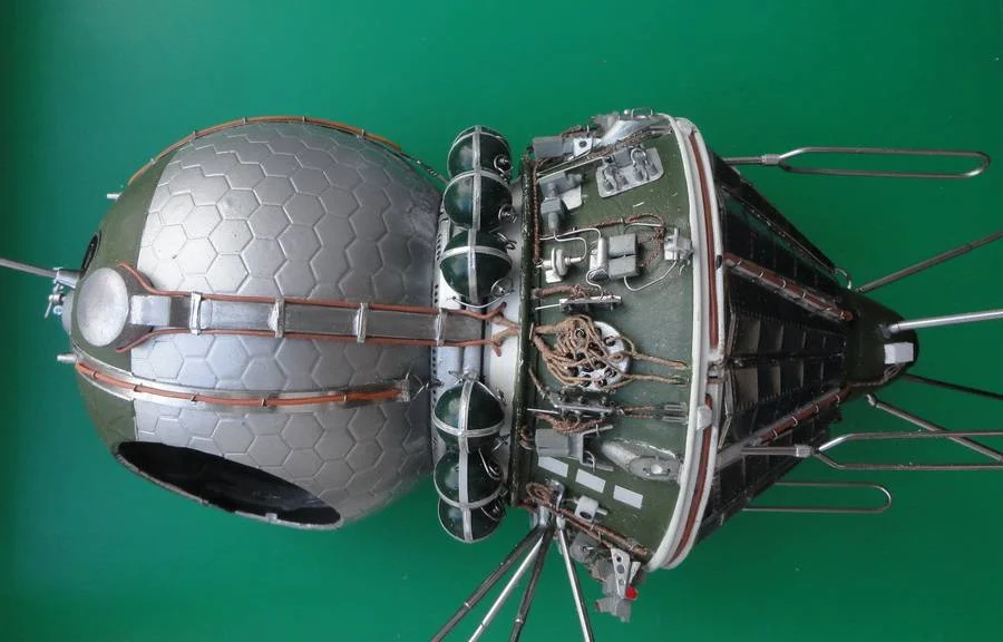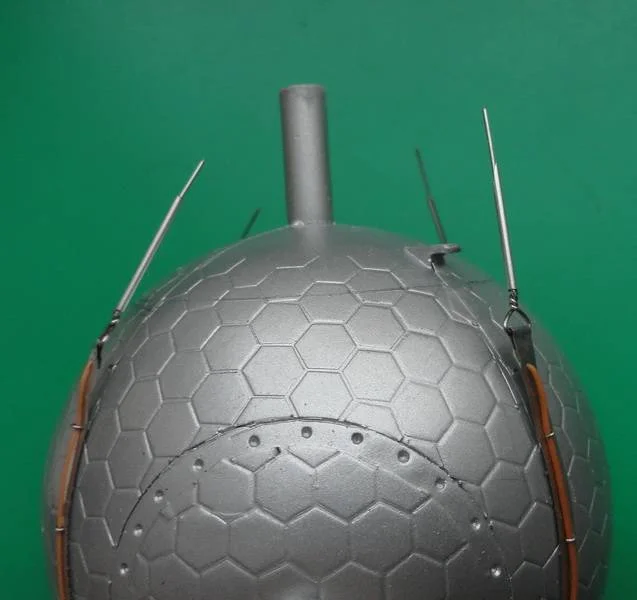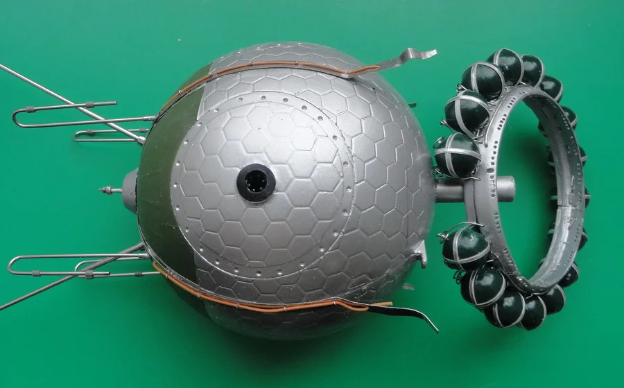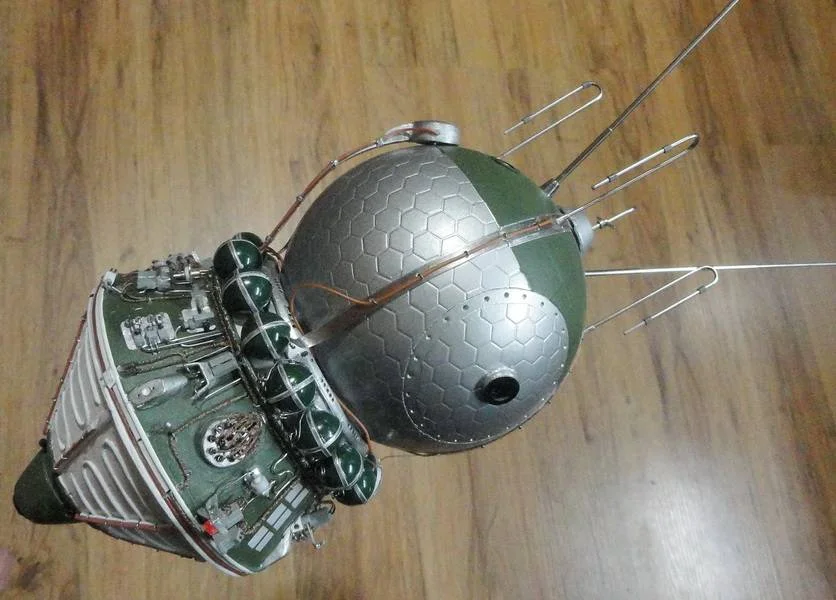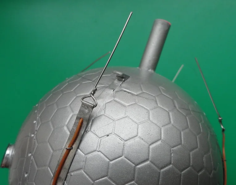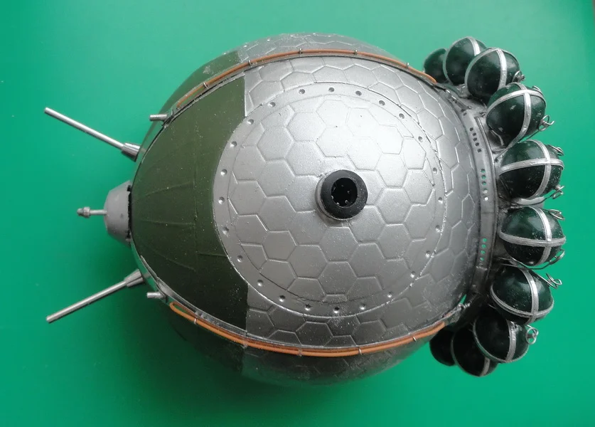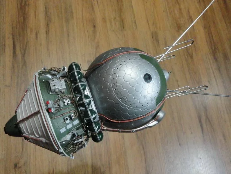 Работа над моделью КК "Восток-1" в режиме орбитального полета закончена. Вот такой кораблик получился небольшой , умещается на ладони руки, только антенны торчат в разные стороны, как иголки у морского ежа. На предыдущих фото он снят как бы в полете на фоне Земли, а на данных снимках- на подставке.
