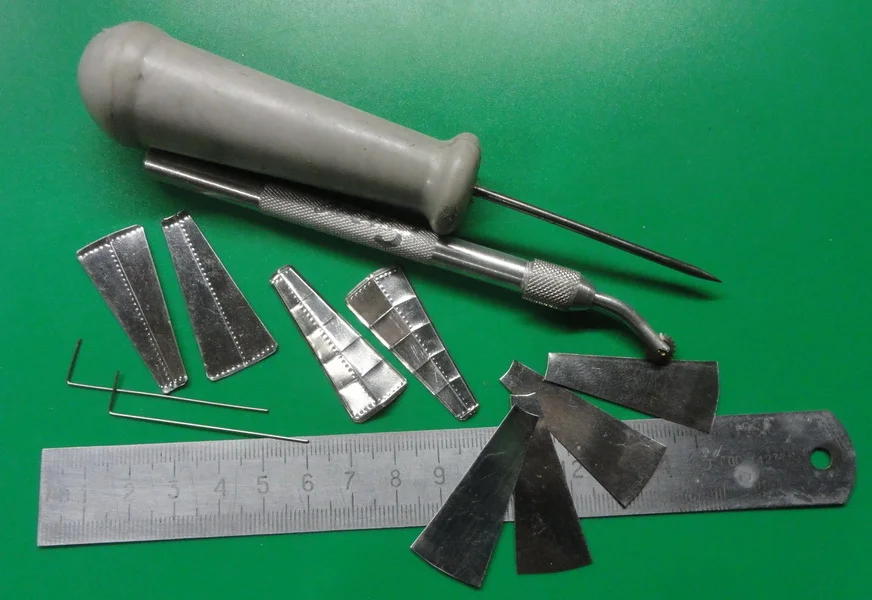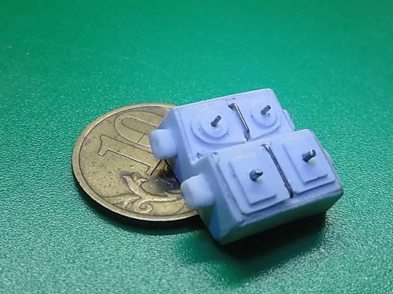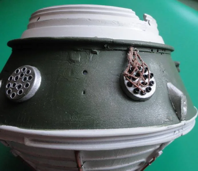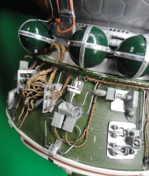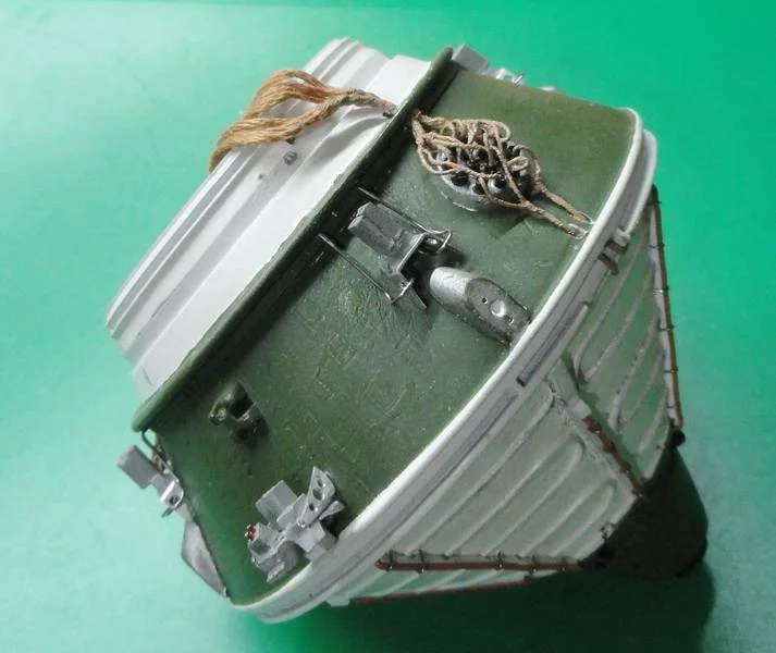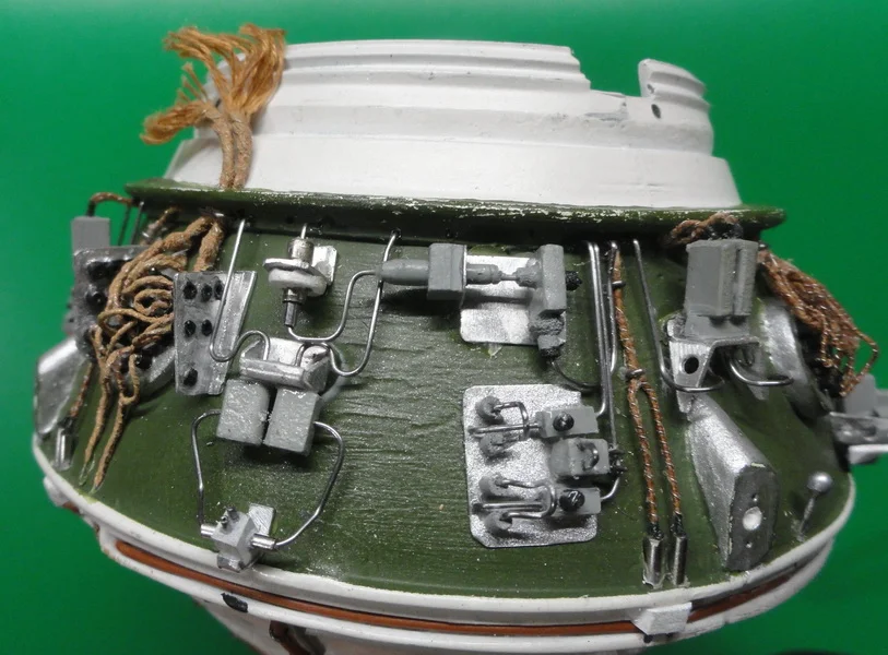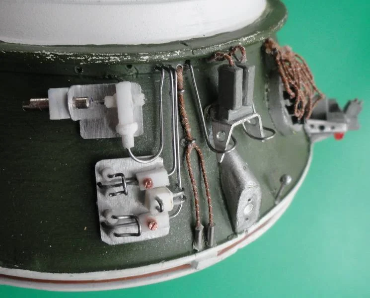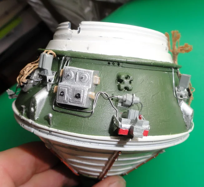 В целях завершения оформления верхнего конуса приборного отсека продолжаю изготовление электрожгутов,контактных колодок, датчиков разделения корабля и третьей ступени ракеты, а также приборов распределения сжатых газов (редукторы, электроклапаны, контрольная аппаратура и пр.) в системах жизнеобеспечения и ориентации космического корабля. Для их изготовления использую подручные материалы - листовой пластик, алюминиевый защитный экран от дискеты ПК, пишущие узлы от шариковой ручки, проволоку, трубку подачи газа от зажигалки. Все изготавливаемые узлы довольно мелкие, поэтому быстро их сделать никак не получается. Пока просто ставлю их на штатные места, чтобы убедиться, что все в порядке. Окончательно клеить буду после покраски, тогда же и кабеля подведу к приборам.