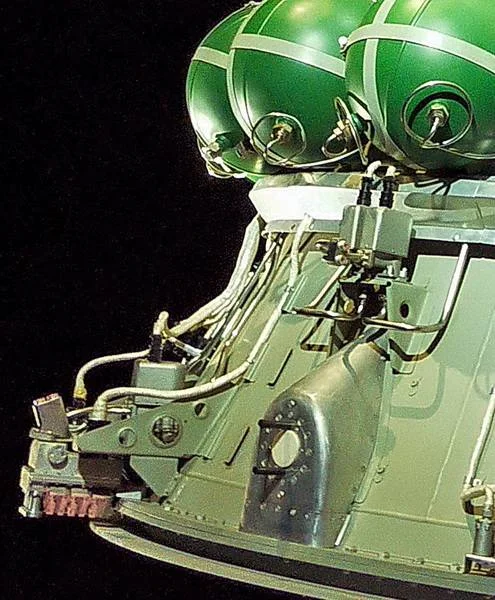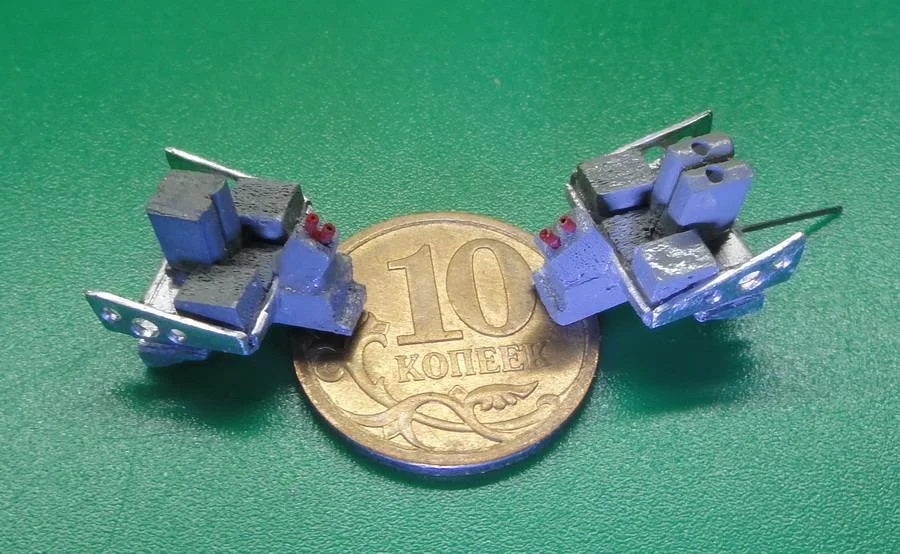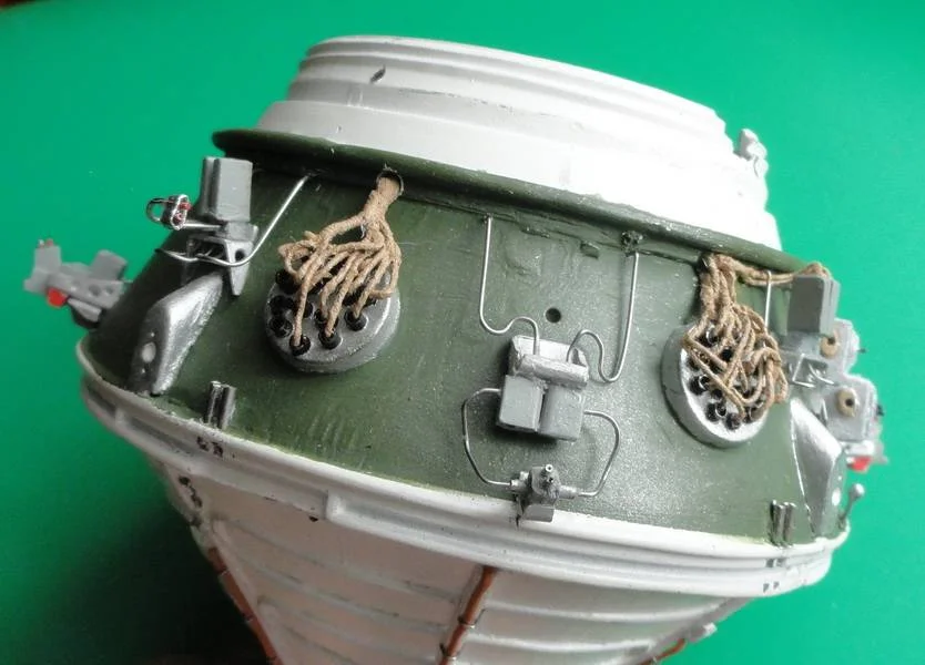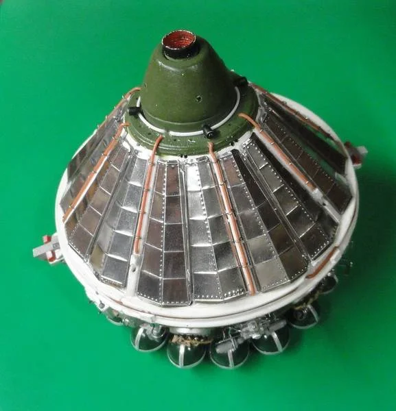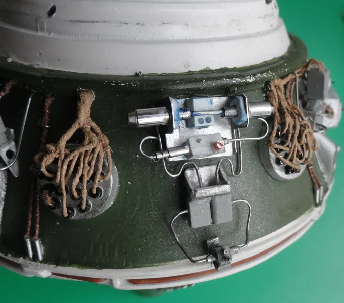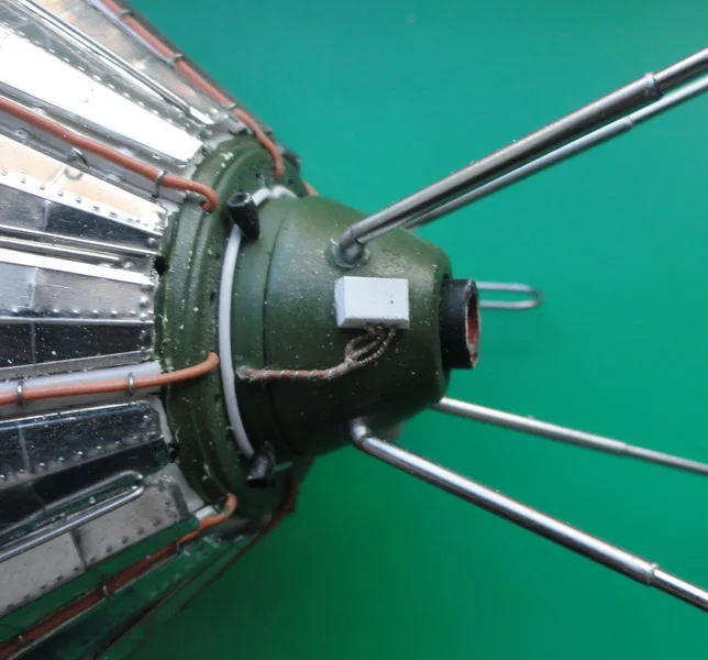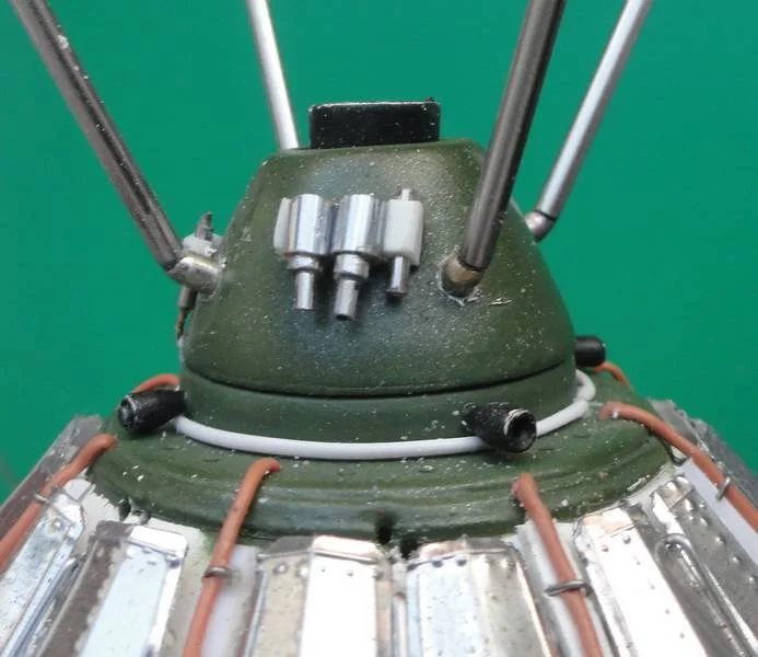 Работа продолжается.Пока сохнут заготовки жгутов, займусь изготовлением элементов системы ориентации корабля,показанных на первых трех снимках. Система ориентации КК состоит из 4-х спаренных двигателей закрутки и 2-х спаренных двигателей тангажа. Все эти двигатели работают на сжатом газе. Двигатели системы закрутки вместе с элементами автоматики (отсечными клапанами)расположены на полках, установленных через 90 градусов на верхнем конусе приборного отсека над датчиками солнечной ориентации и попарно направлены в противоположные стороны. Двигатели тангажа находятся на полках вместе с электроразъемами, соединяющими космический корабль с третьей ступенью ракеты.