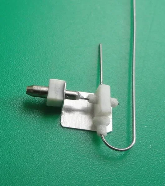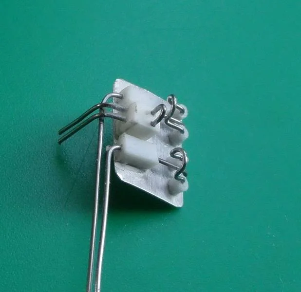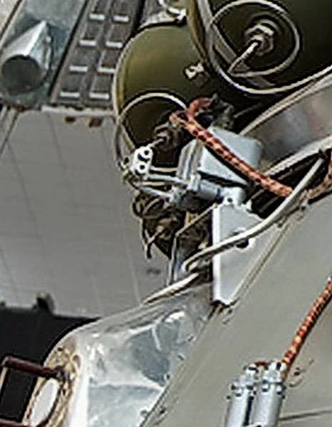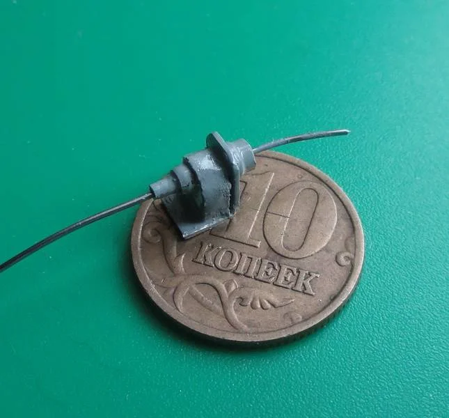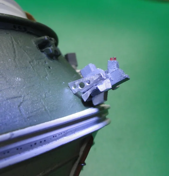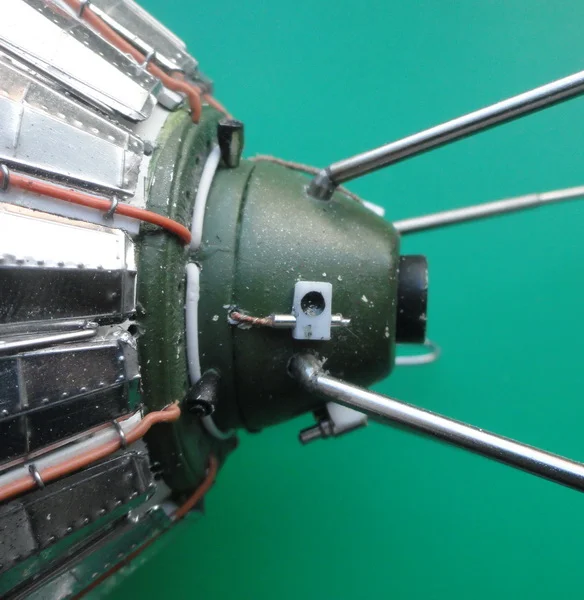 Изготовленные элементы системы ориентации установил на корпус приборного отсека и присоединил к ним трубопроводы подачи сжатого газа, которые согнул из проволоки Ф 0,6мм. На фото №4 показан блок электрокоммутации, возможно что системы ориентации. Его изготовил из листового пластика и обрезков проволоки. Заранее приклеил к нему фишки разъемов и просверлил в них отверстия , куда позднее заведу жгуты электрокабелей. После этого приклеил деталь на штатное место.